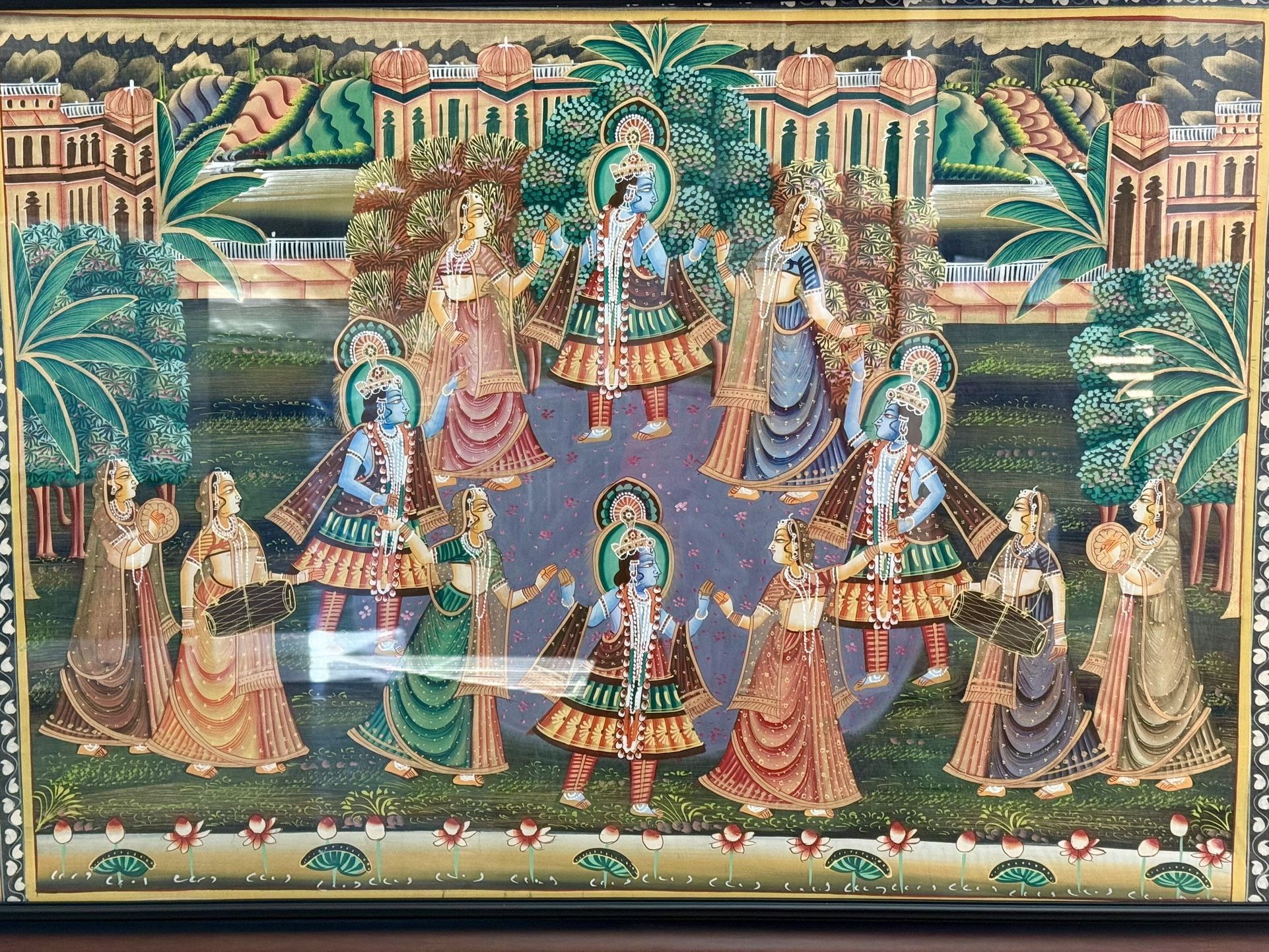 Enhance your home with this exquisite painting of Lord Krishna with gopis, radiating divine charm and elegance. • Dimensions: Approximately 40.5 inches (H) x 29 inches (W) • Condition: Excellent, well-maintained, and ready to adorn your space • Details: Rich colors and intricate details, perfect for creating a serene and spiritual ambiance Ideal for living rooms, meditation spaces, or as a thoughtful gift.