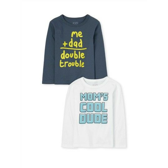 Multiple Size 18-24 Months 2T 3T 5t Price is for each pack of 2 $10.00 Made of 60% cotton/40% polyester jersey; side-dyed for a heathered look Pack of 2 graphic tees includes: 1 tee with 'mom's cool dude' graphic design at front 1 tee with 'me + dad = double trouble' graphic design at front Rib-knit crew neck Tagless label Long Sleeve tees Comes from a Smoke Free Pet Free Home.