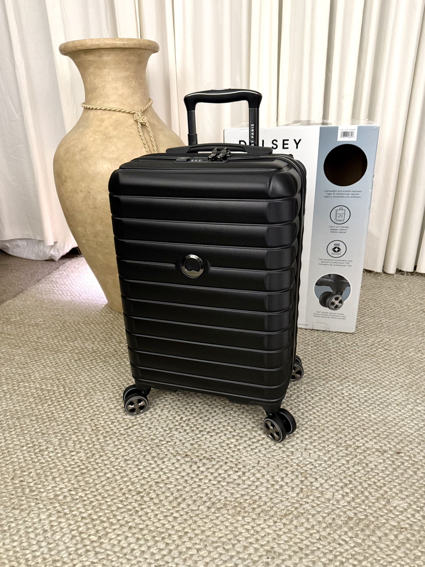 Delsey Hardside Carry on Spinner Suitcase Delsey Brand TSA Lock Expandable Color Black Dimensions 22 x 13x 9 in Delsey suitcase is constructed of lightweight 360 spinner wheels YKK Fusion 100% Polycarbonate Textured scratch-resistant finish Interior Features: Mesh Pocket, Multiple Compartments, Adjustable Straps, Lined Number of Wheels: 8