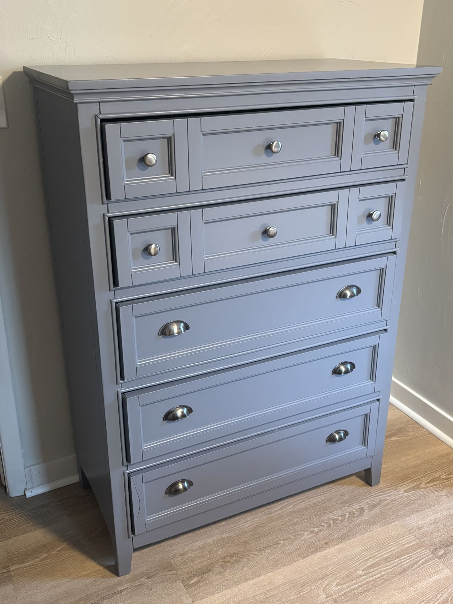 Beautiful dresser with two small blemishes (pictured- chip on top back and crack on face of drawer only affects the looks, not function!). I also have a small desk that matches this dresser for a small additional charge-ask if interested :).
