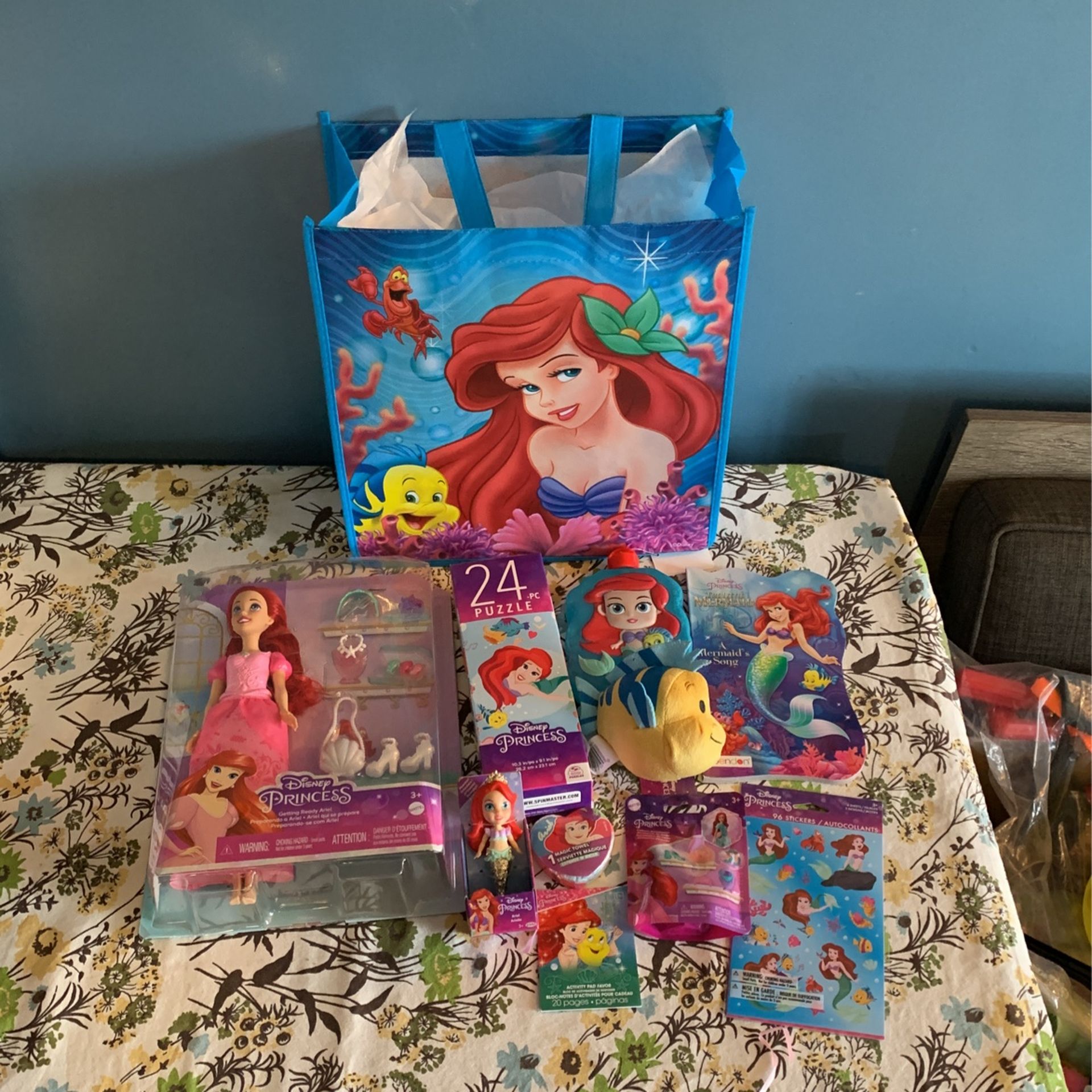 Includes choice of bag, tissue paper, doll, book, and all items (doll, sticker set, mini figure, mini activity book, Flounder plush, puzzle, magic towel, bubbles, accessory pack).