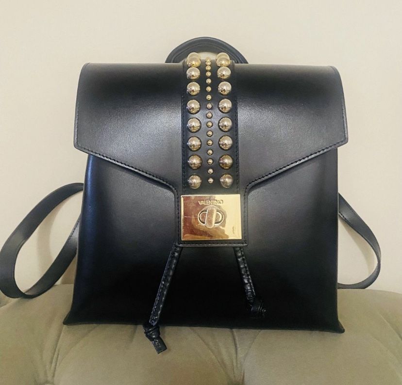 Is like new,used twice.A little scratch on the back under the handle see pic 4.Adjustable straps.1 zip pocket. Has some spots in the front but they are not noticeable maybe they can be removed.Some scratches on the Gold closure plaque in the front.Come with the dust bag.Please if you have any questions let me know.