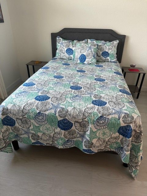 Full size bed. Complete bed frame with head boad. Mattress and wood slates included.