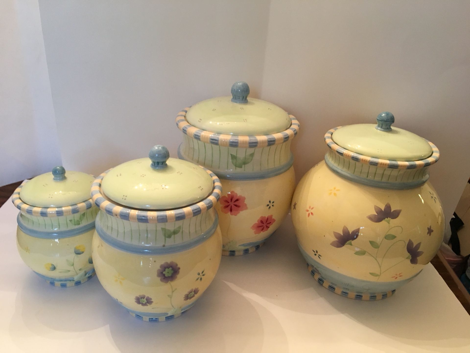 Debbie Mumm Spring Flower Design - 4 small to large canisters with rubber suction lids. In excellent shape, with a chip on the bottom of one lid, light discoloring on bottom of jars and lids, and a chip on the bottom of the big canister. A great addition to any kitchen! The set was sold by New Creative Enterprises Inc., Milford, OH 45156 Transaction location is Wendy's restaurant,4245 cemetery rd, hilliard 43026.