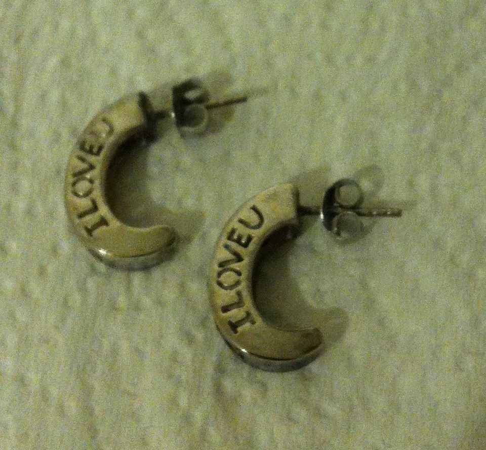 Half Hoop Silver Tone I LOVE YOU Pierced Earrings Clear Rhinestones. $10 takes it. 3/4" vertical. Not marked. I don't know the age of them.