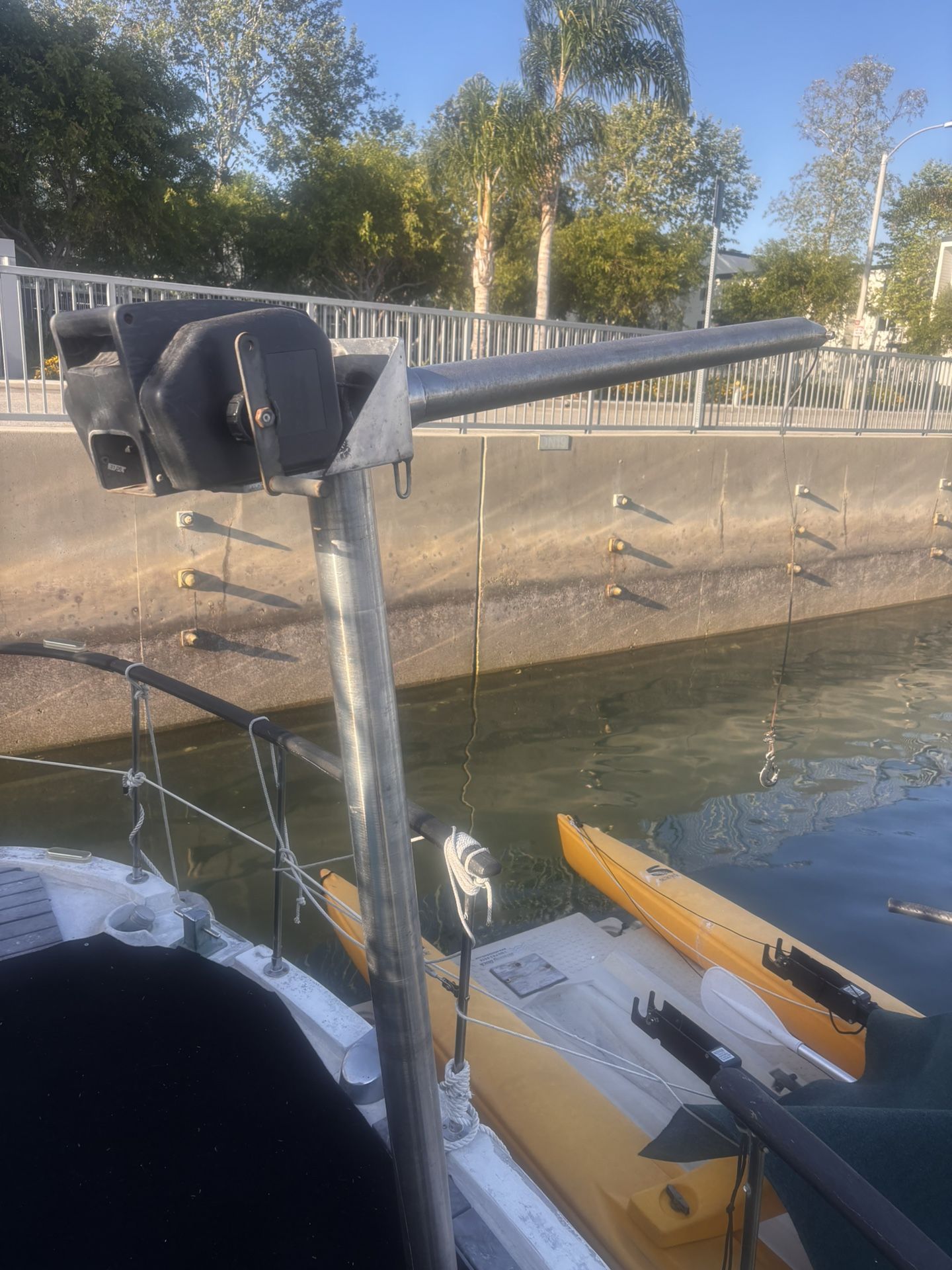 This is a small boat crane that I used to get my two-man sea cycle in and out of water. It's Manuel or Electric. It's completely stainless and heavy duty can hold up to 2500 pounds. Thanks, Tom.