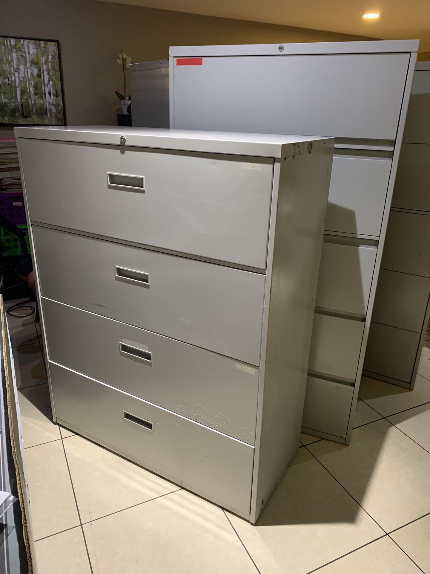 Used filing cabinets in perfect working condition. No key. Locks can be easily changed. (1) 18d x 30w x 64.25h - 5 Drawer $525 obo ($885.00 new) (2) 18d x 36w x 64.25h - 5 Drawer $550 obo ($927.00 new) $1000 for all 3