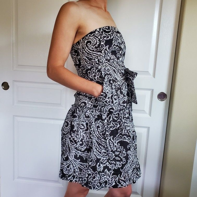 American Eagle. Size 4. Mini ruffle dress. Strapless. Lined. Lightweight. Black and white paisley print. Decorative buttons. So timeless, cute, and versatile. Easily dressed up or down. Smoke-free home. Model is 5'6".