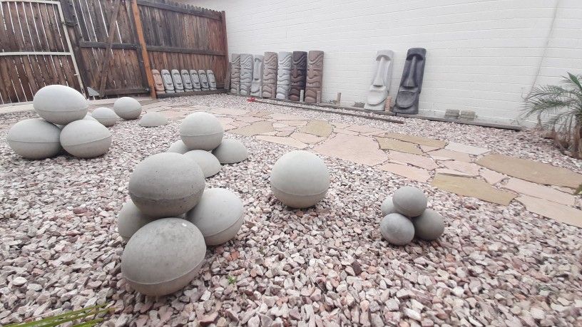 6" Cast Stone Balls $15 each 9" Cast Stone Balls $30 each 12" Cast Stone Balls $60 each 12" 1/2 Dome $30 each Discount for The Set of 3 Sizes Natural Grey $100 Can be painted too, Fun Geometric Yard Decor Yard Art Statuary Lawn Driveway Markers Parking Bump Stops Curb Funky Decorations Also Many Statues and Tropical Hawaiian Island Decorations Wood & Concrete - Cement. Aloha, Oasis, Moai, Carving & Statues. Starlight Tiki