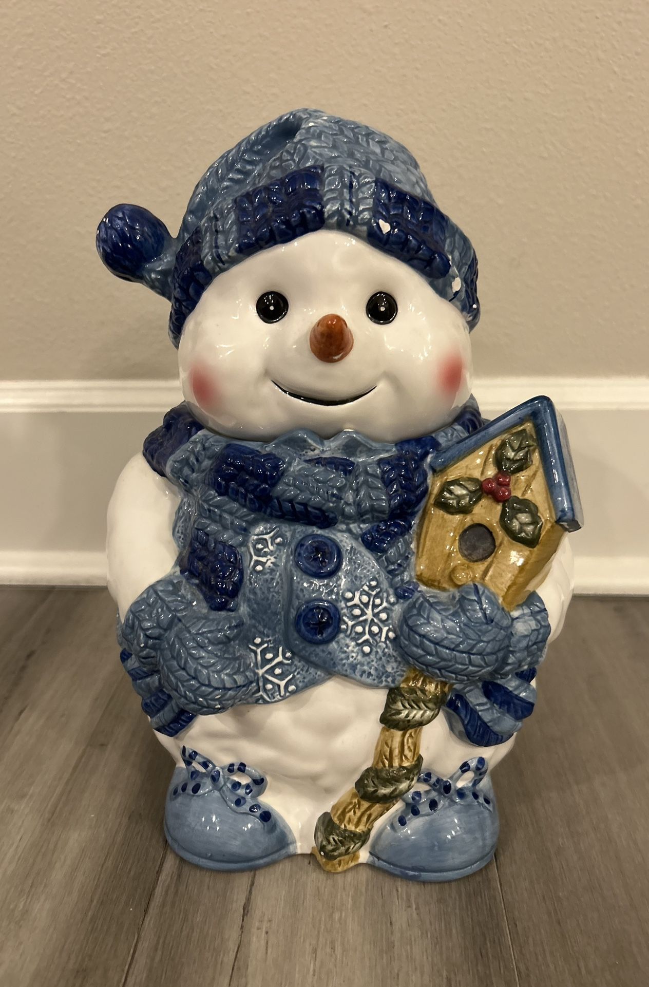 Blue & White Snowman Cookie Jar with Birdhouse – Holiday Decor