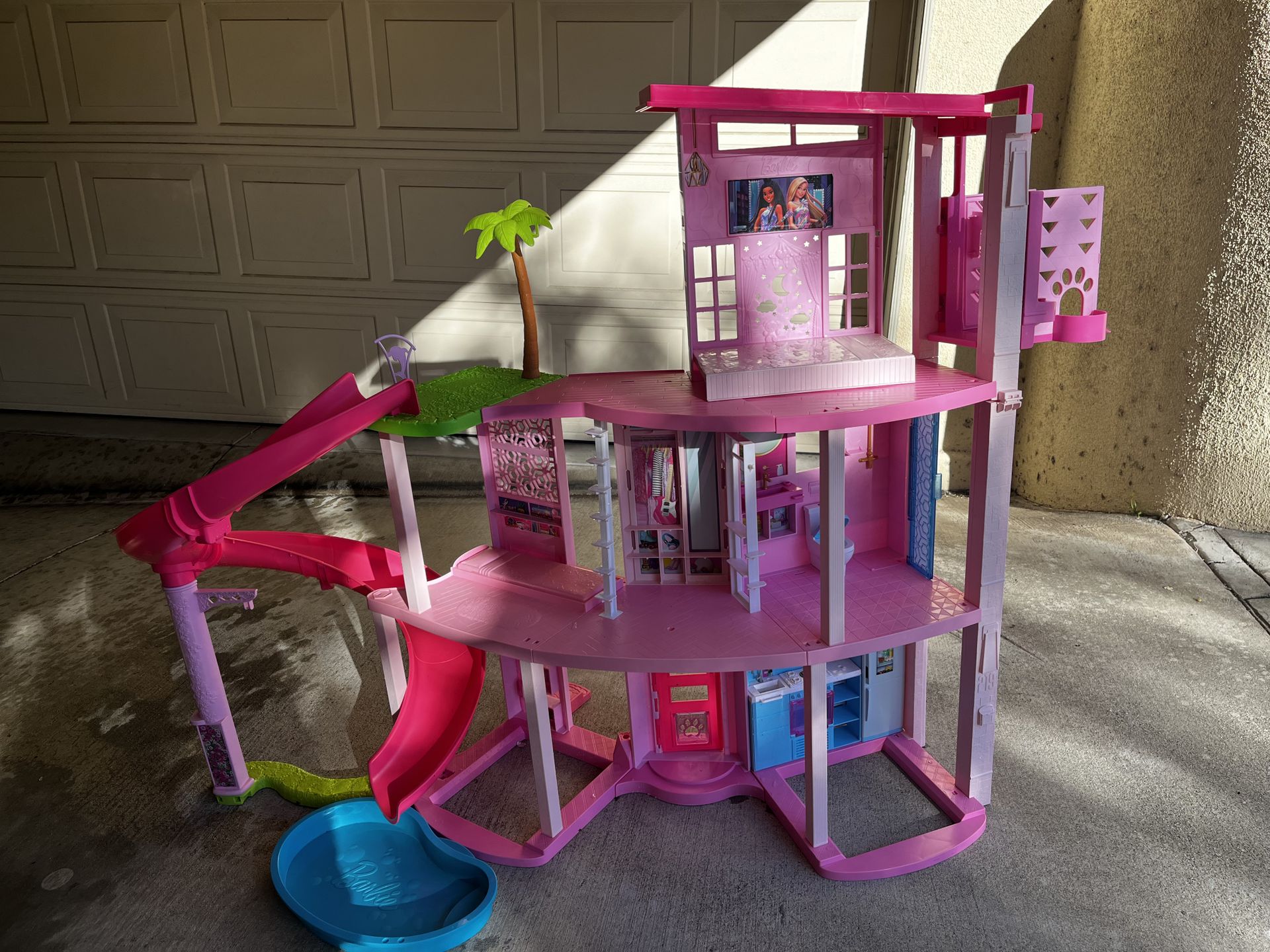 Item is gently used, cleaned, and ready for a new home. Kids can host the ultimate pool party with the Barbie dream house. This deluxe doll house has the tallest slide in the Barbie dream house series to date, with a three-story spiral design for endless fun in the sun. It inspires 360-degree play with a wide and spacious floor plan, three levels, and 10 indoor and outdoor living areas. The play set also features more pet-friendly touches than ever before, including a puppy slide and pool where furry friends can play along with Barbie doll. Plus, the top floor bonus room wows with a sleepover changes that allows the dream house to sleep four dolls. With 75+ accessories and customizable spaces that double the fun, it makes an exceptional gift for kids ages 3 years old and up. Assembly required. Dolls not included. Colors and decorations may vary. Features Warning- choking hazard - small parts, not for children under 3 years Recommended age- 3 years and above Product dimensions- 30" L x 8.5" W x 30" H Product weight- 31.96 lbs Set includes- 3-story Barbie dream house (assembly required) and 75+ pieces, including a pet puppy, dolls not included, colors and decorations may vary Welcome to the Barbie dream house, where 360-degree play inspires endless fun, this updated version of the iconic doll house features an open design, premium features and 75+ storytelling pieces Barbie can host the pool party of her dreams with her home's spectacular three-story spiral slide, Watch as Barbie doll and her friends swirl down the slide into the pool, dolls not included This doll house doubles as a veritable pet palace, and even includes a puppy figure, furry friends will have a blast with the pet elevator, pet slide and pool, pet bed, doggie door and pet house Right from the start, kids can spend hours exploring ten different play areas- a kitchen, living room, dining room, bedroom, bathroom, closet, bonus room, balcony, pool and the biggest slide yet The pool party can turn into a slumber party with space to sleep four dolls, the living room console transforms into the ultimate sleepover spot with a starry backdrop and an extra bed for two Assembly required For 1 player Requires 3 AA (LR6) alkaline batteries (not included) Plastic, Polyester Spot Clean Imported