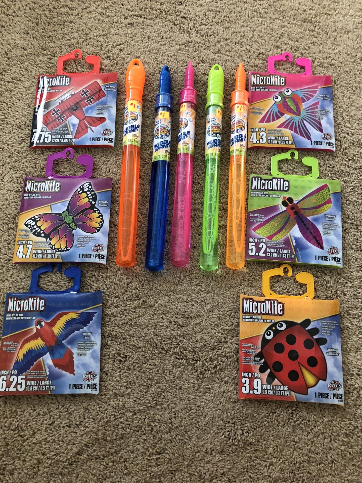 Six colorful micro Kites that come with handle and line & Sky tails, Ready to fly or just hang from the ceiling. And five bubble ones with bubbles. Get it all for $15.