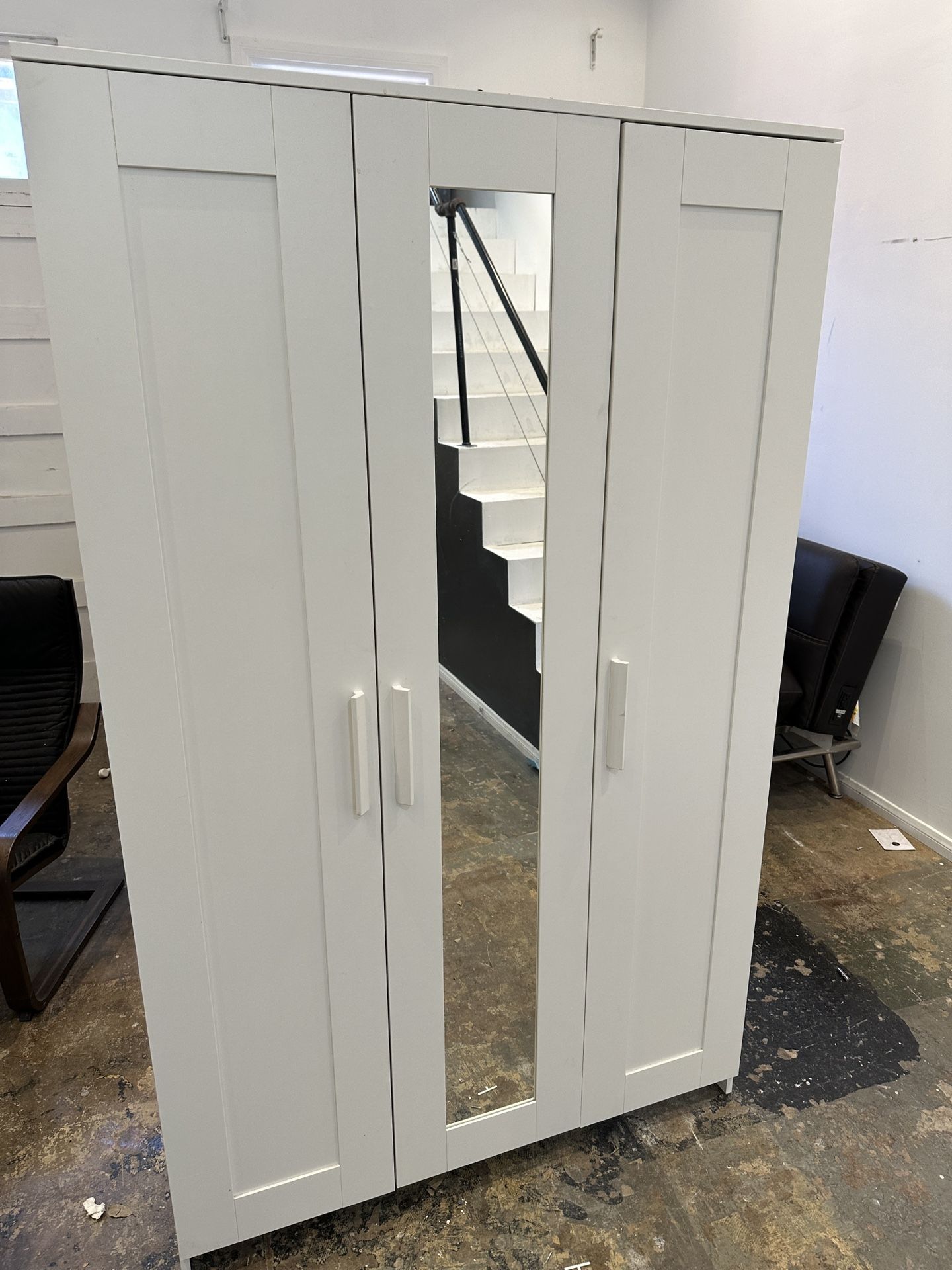 White wardrobe closet 3 doors. Measurements: Width- 46in Depth- 19 3/4in Height- 74 3/4in