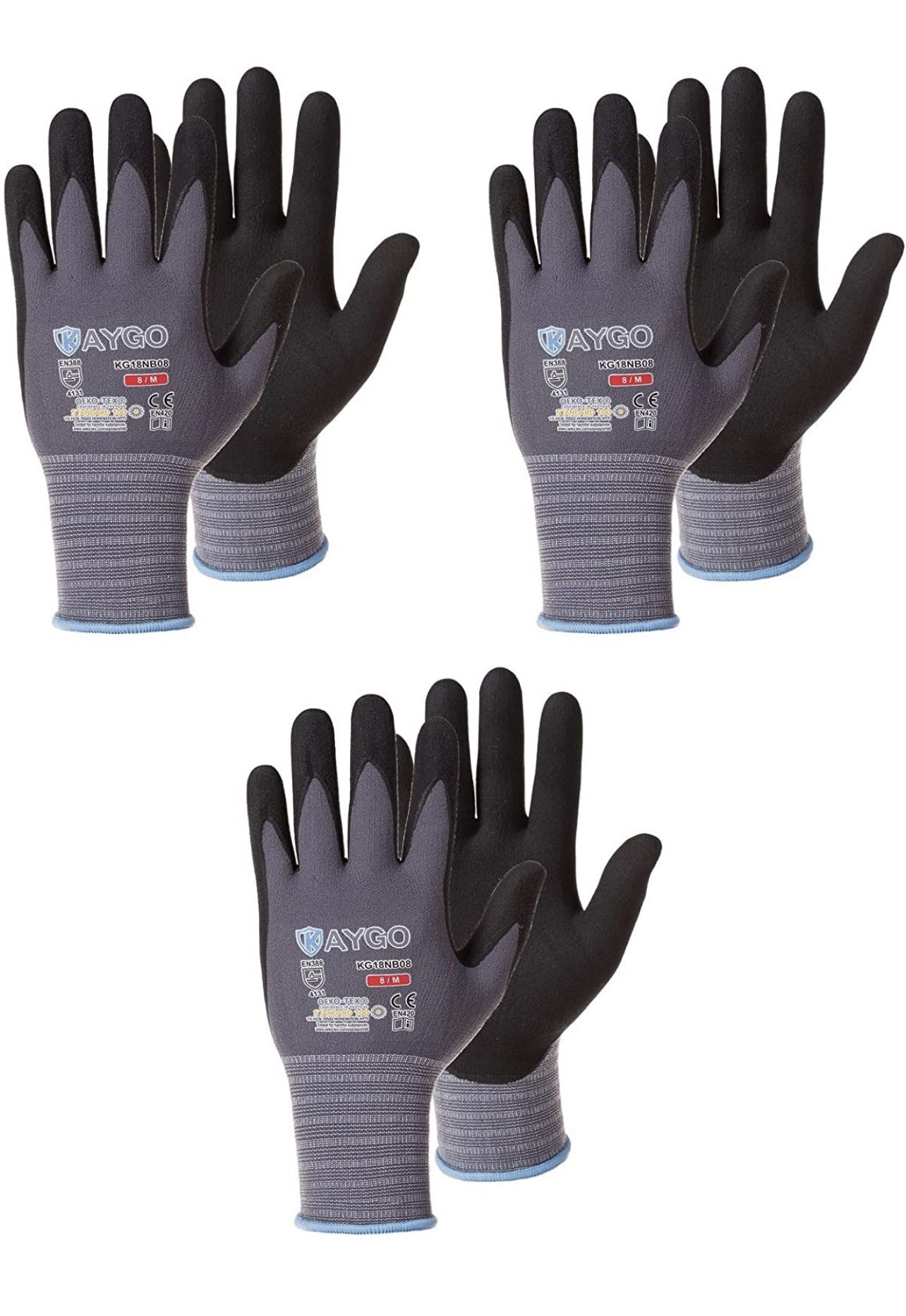 Safety Work Gloves MicroFoam Nitrile Coated-3 Pairs Seamless Knit Nylon Glove with Black Micro-Foam Nitrile Grip,Ideal for General Purpose,Automotive,Home Improvement ✔️SUPERIOR GRIP and ABSOLUTELY BREATHABILITY:Micro-Foam Nitrile coatings are compatible with light oils and will provide a good grip and excellent abrasion resistance. Ultrathin Design provide absolutely breathability and with water repellent performance. ✔️EXCELLENT DEXTERITY and COMFORTABLE: Economic designed comfortable 3D snug fit into all fingers.Seamless liner and spandex assure a maximum comfort and minimum hand fatigue. ✔️MORE DETAILS:Knit Wrist helps prevent dirt and debris from entering the glove. ✔️COMPLIANCE: CE CERTIFICATED EN(contact info removed) ✔️Recommend washing gloves in tempered water not exceeding 104℉or 40℃. A mild non-ionic laundry soap or detergent should be used. Wash in a 5-10 minute cycle time. Rinse in cold water. Tumble dry at temperature not exceeding 140℉or 60℃