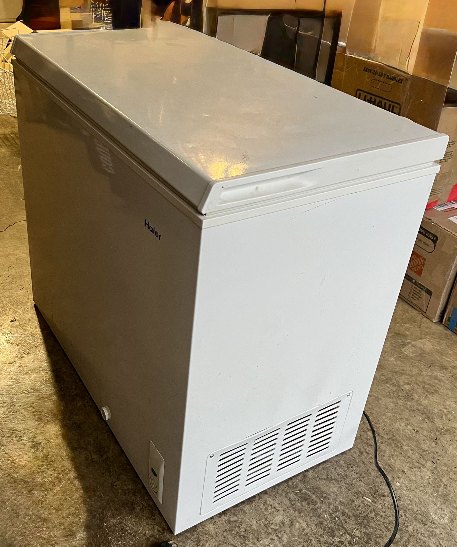 Haier 7.1 cu. ft. Chest Freezer HCM071LC. Holds 249 lbs of frozen food; Front designed thermostat control for easy access; Power light; Removable basket for easy access; Flat-back design; Heavy-duty spring-loaded top door hinges; Manual Defrost 37 “ high x 33.25” wide x 22.06” deep Works perfectly. Great for the holidays, hunting season, Costco shopping!