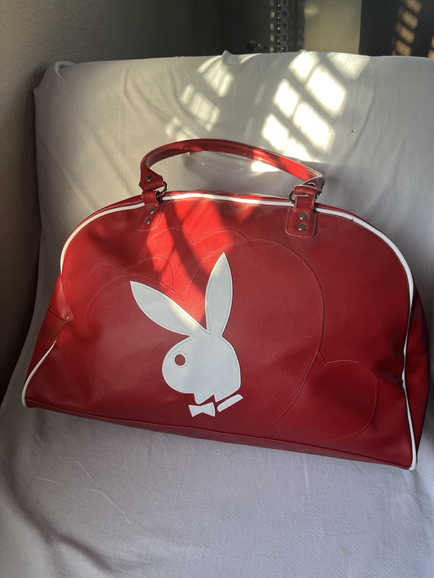 Elevate your style with this vintage red leather official playboy duffle bag! Crafted by the official makers of Playboy, this iconic high-end bag perfectly balances allure and premium quality. This exemplary duffle can be collected or worn to make a bold statement and features a spacious hot pink interior that can fit all your belongings with ease. With just a minor stain near the inside zipper this stylish bag can be a staple to your wardrobe or showcased as an iconic classic in your home!