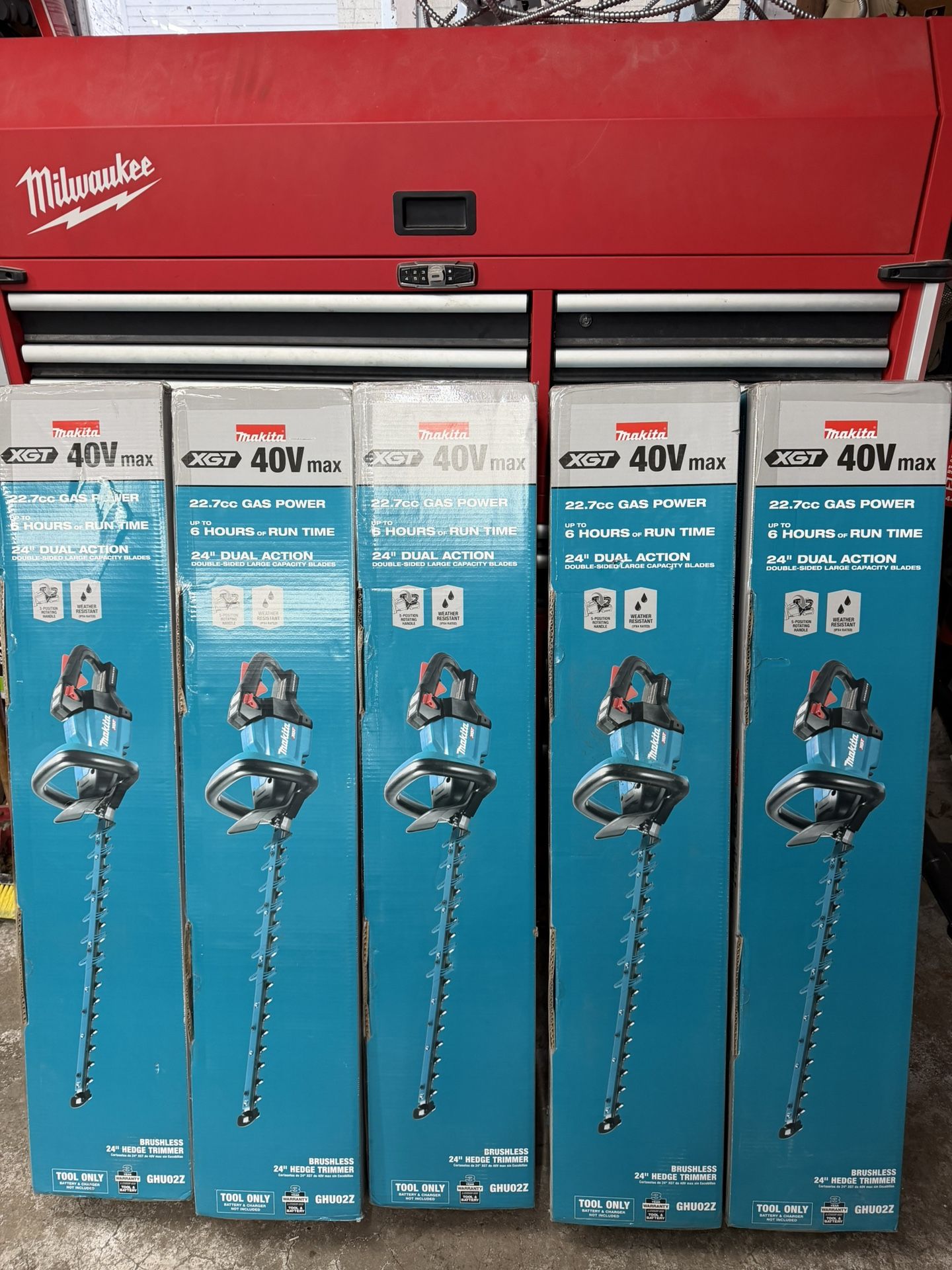 140$ EACH With zero emissions and lower noise, the 40V max XGT Brushless Cordless 24" Hedge Trimmer (GHU02Z, tool only) is a welcome solution for professional landscaping clean-up applications. The Makita-built brushless motor delivers up to 5,000 SPM for powerful trimming. It has three speed options to manage power and run time.The 24" dual-action double-sided shear blade provides optimal performance. A reverse function clears jams. The hedge trimmer can get up to 6 hours of run time using one (1) 40V max XGT 4.0Ah Battery. The 5-position rotating rear handle provides increased comfort during vertical and angle trimming. A tip guard protects the end of the cutter bar against hard surfaces.For added durability in harsh job site conditions, Extreme Protection Technology (XPT) is engineered for improved dust and water resistance. The power head also features IPX4-rated weather-resistant construction for added durability. OUTPOWER: Makita-built brushless motor delivers Up to 5,000 SPM for faster cutting OUTSMART: 3-speed options (Low: 2,000 SPM, Medium: 3,600 SPM High: 5,000 SPM) for power and run time management OUTLAST: Up to 6 hours of run time using a 40V max XGT 4.0Ah battery (battery sold separately) 24" dual action double-sided shear blade provides optimal performance 5-position rotating rear handle for increased comfort during vertical and angle trimming Reverse function for clearing jams Anti-vibration design for operator comfort Tip guard protects the end of the cutter bar against hard surfaces IPX4 weather-resistant construction for durability and long life Extreme Protection Technology (XPT) engineered for improved dust and water resistance The digital communication within XGT optimizes performance to provide up to 2X longer sustained power under heavy-load applications The digital communication within XGT actively monitors and protects against overload, over-discharge and overheating XGT Tools and Batteries are designed with a multi-layer contact interface for more constant power delivery to take on high-current demands XGT Batteries feature rigid rails with impact-resistant construction to secure the battery to the tool during high-demand applications (batteries not included) The XGT Rapid Charger with dual-fan design circulates air through the battery to cool the battery and circuit board quickly for faster charging (charger not included) The XGT Rapid Charger's digital display indicates battery charge level (-80%, +80%, 100%) The XGT Rapid Charger's built-in chip thoroughly communicates during the charging process to control current, voltage, and temperature for more efficient charging Compatible with Makita 40V max XGT Lithium-Ion Batteries