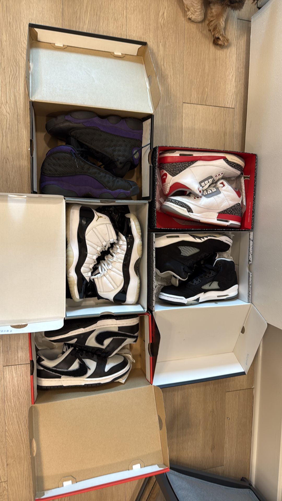 Jordan 3 fire red, Jordan 5 Oreos, Jordan 11 Gratitudes, Jordan 13 court purple , Nike dunk fogs