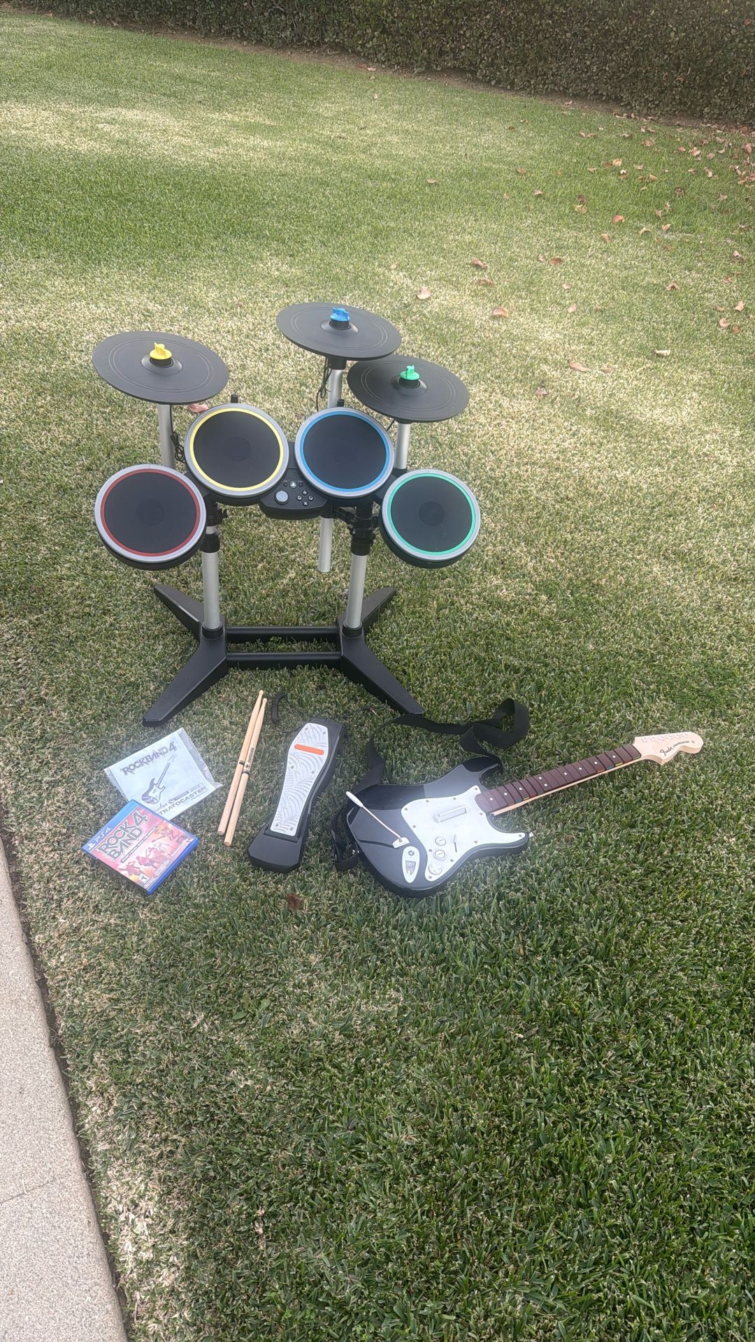RockBand 4 For PlayStation 4 (PS4) Complete Setup With Cymbals, kick pedal, sticks, guitar, clean disk and instruction manual. 2015 with minimal use. Great Deal as others are being sold individually and much higher. Great gift idea for collector or youngster!