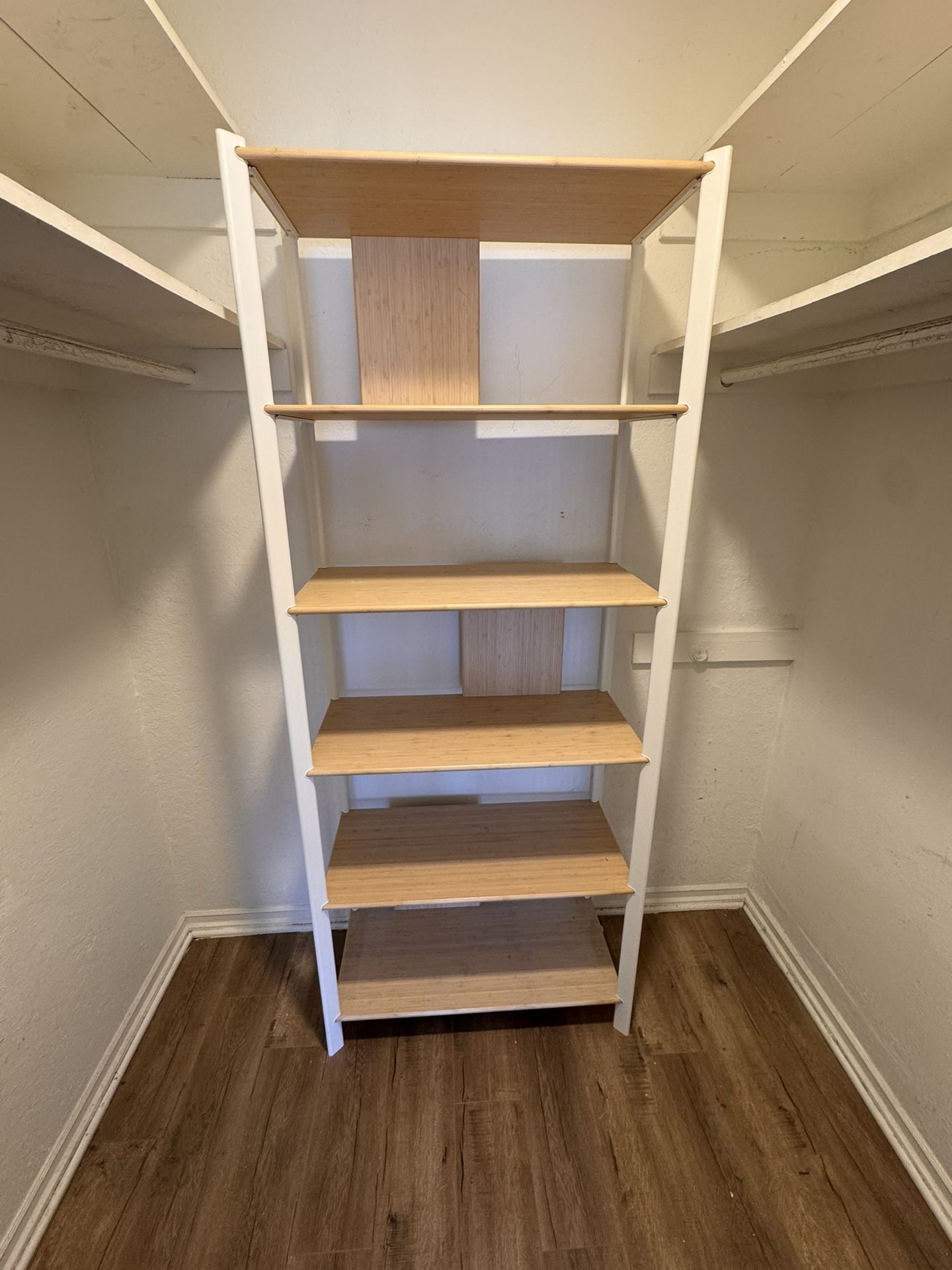 This is a freestanding shelving unit. Measures 77H 32W, perfect for closets, pantries, or general storage. The frame is a sturdy white finish, while the shelves are a light wood tone that gives a modern, clean look. The unit features five spacious shelves with a vertical wooden accent panel running through the back for added stability and style. Like new condition.