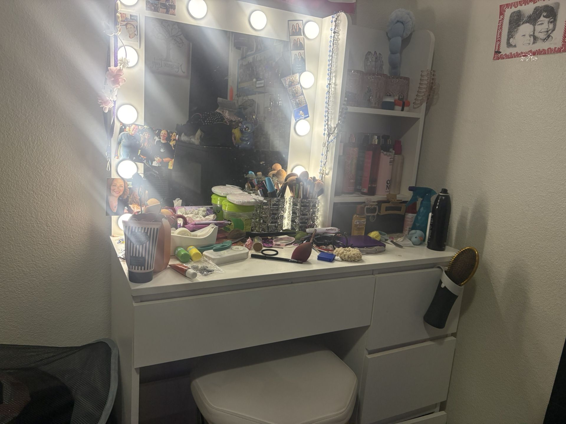 Selling my daughter’s makeup vanity. The bottom drawer front pulled away but it’s fixable. No other issues and everything else is perfectly fine on it. This is a pick up only. Vanity is 37” wide. The stool is included.