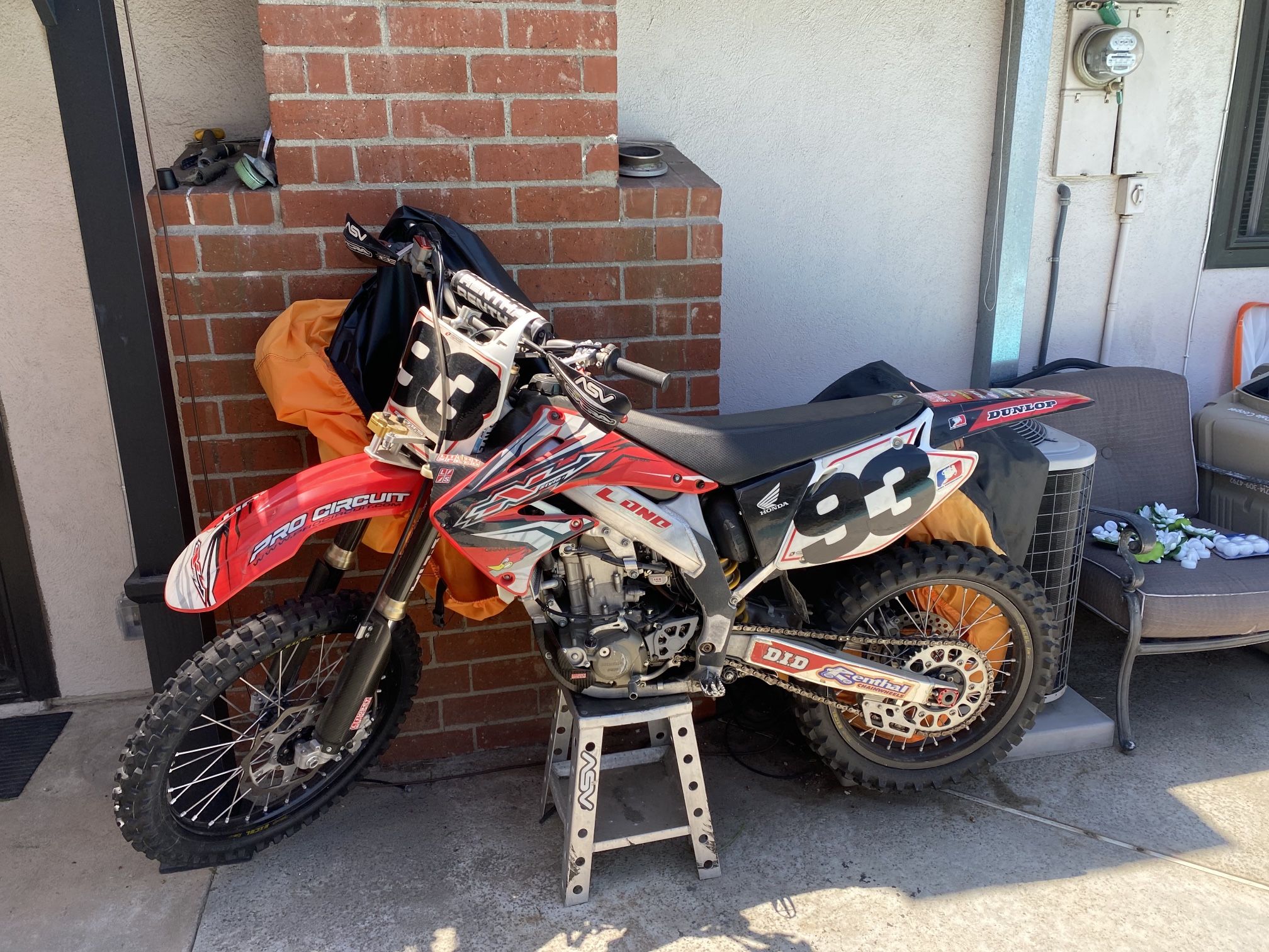 Honda CRF-450 dirt bike -low hours -Recently tuned up - 1 kickstart -ASV levers -Scott steering stabilizer -RG 320mm offset triple clamps -All light speed carbon fiber accessories -White Brothers pro pipe exhaust, titanium head pipe with carbon fiber muffler -Suspension work is brand new -RG 320mm tuned and sprung for a heavier guy (I’m 6ft, 280) -Excel custom black wheels and hubs, heavy duty spokes -including all original parts, extra wheels, bark busters, plastics etc. -Tons of gear can also go with it