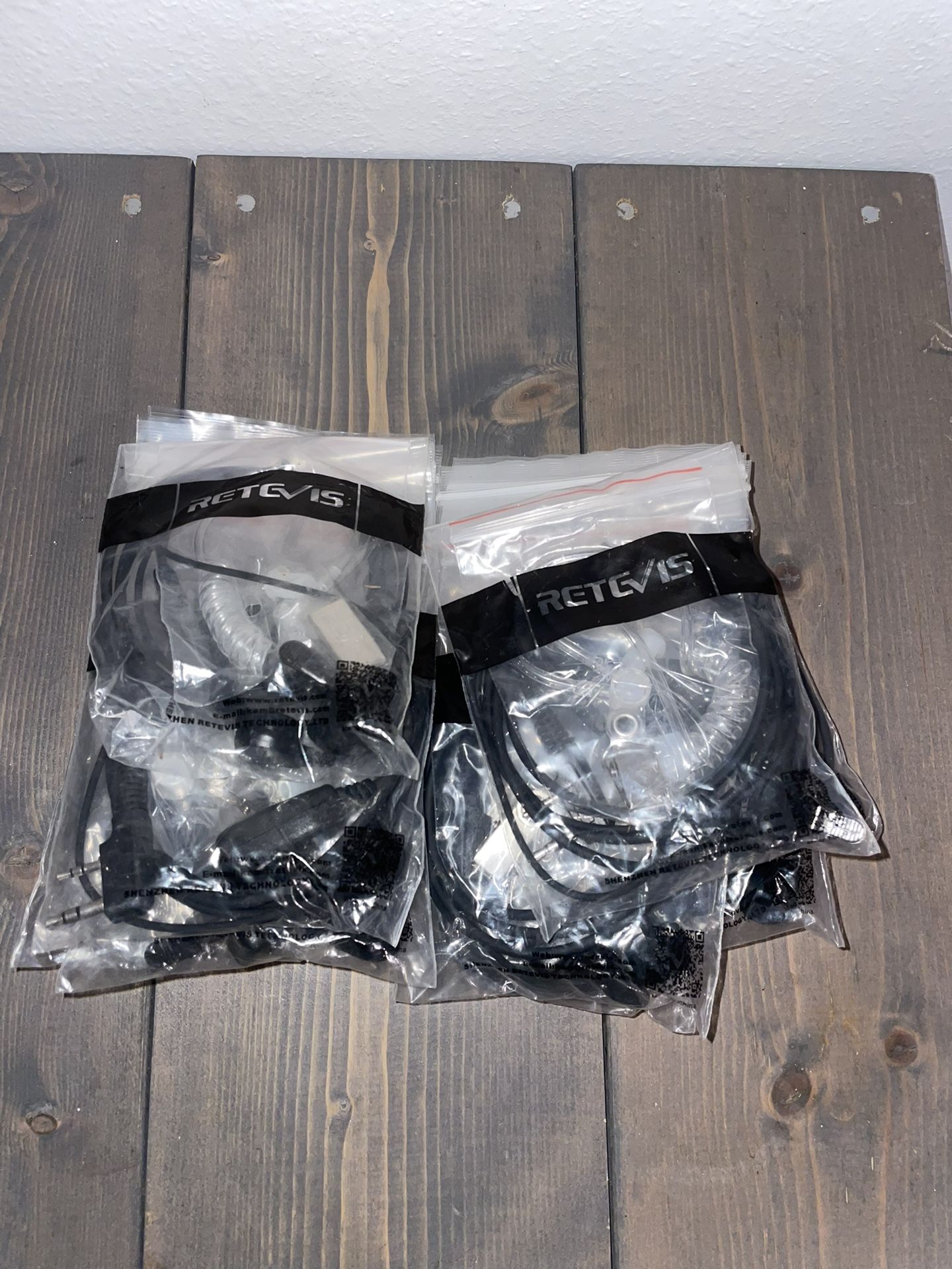 Retevis Radio Earpieces – 10 Pack (New) Description: Brand new Retevis radio earpieces, lot of 10 total. Acoustic tube style with clear coiled tubing, push-to-talk mic, and ear hooks. Still sealed in individual bags. Great for security, events, construction, or two-way radios. Condition shown in photos.