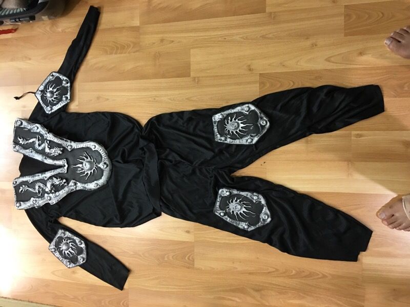 This used only once. I think it is black fire dragon costume. Comes with black suit and arm and shin guard accessories Slight need of stitching the arm and shin guards elastic holders Size: kids 10-12