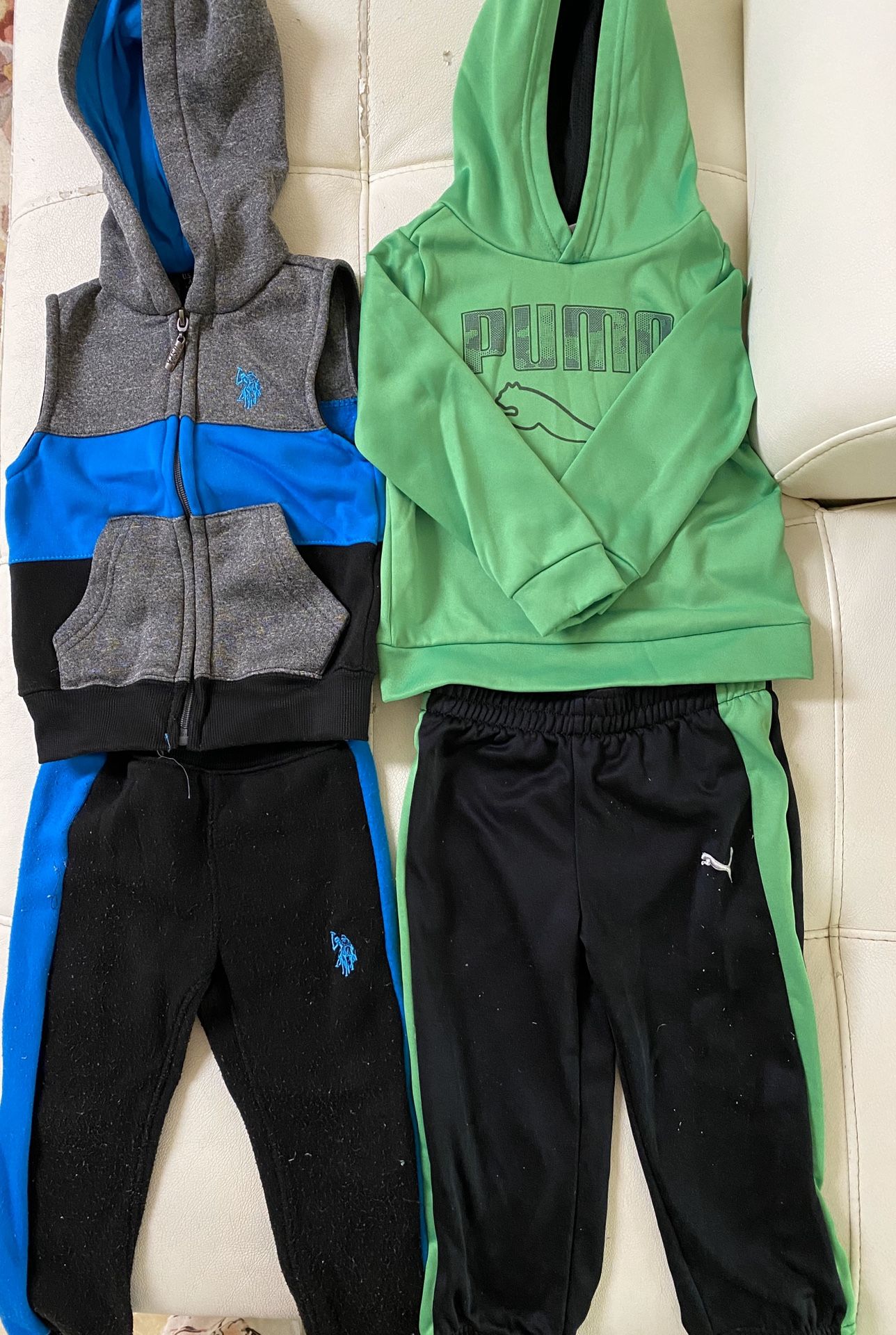Polo outfit size 2T in fair/good conditions Puma outfit size 24M (same as 2T) in great conditions Both items have a little fussies on the pants which I could take out before shipping but they been washed and stored. Smoke free pet free home. Check my other outfits to bundle! Better pricing better shipping.