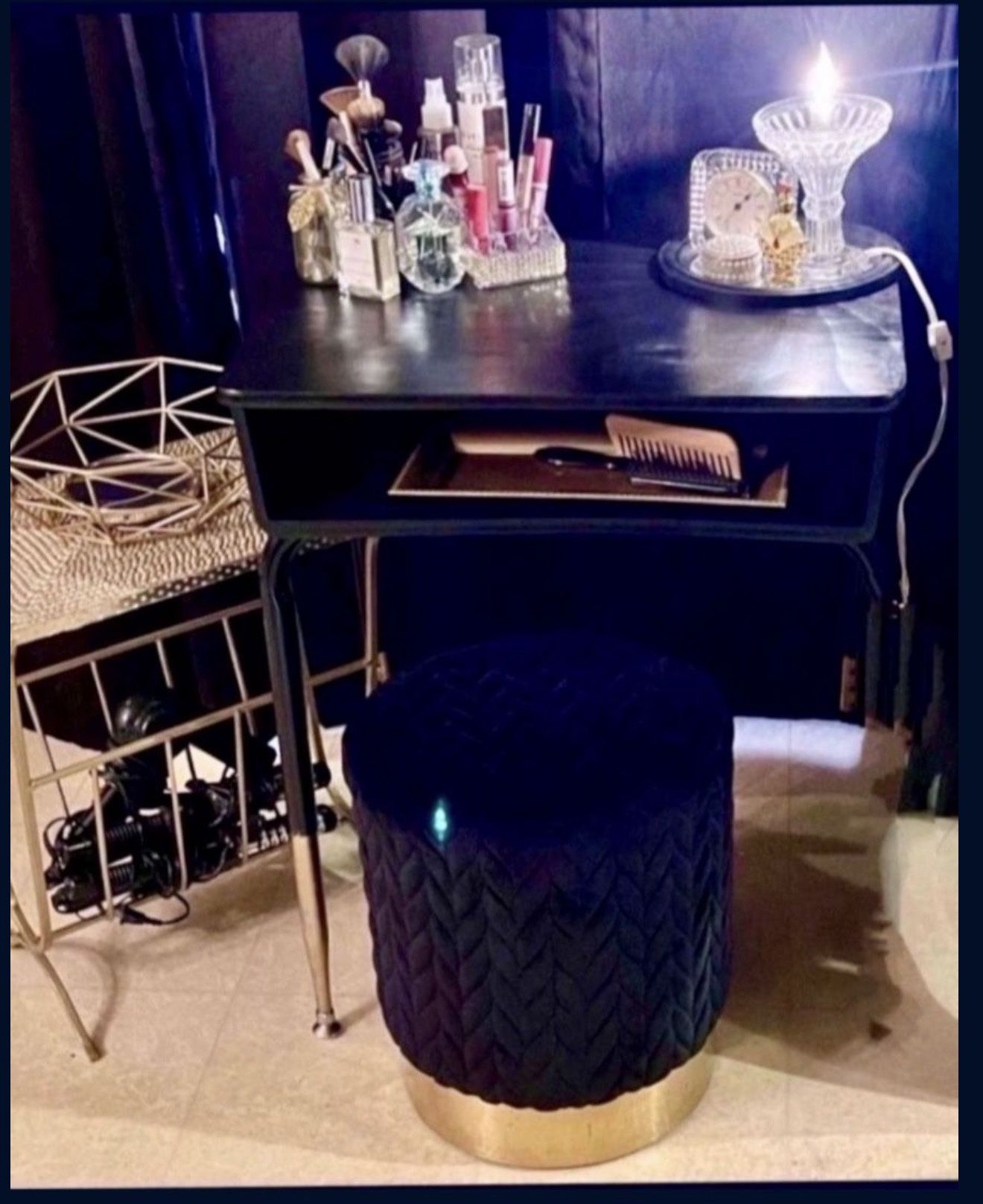 Black Vogue bundle just for you! unique items Desk Set Includes Luxurious Glistening Chic Lamp, Stunning Chic Black Stool, Decorative Exquisite Gold side Table and Gold basket Black Desk makes the perfect gift choice or gift yourself this beauty! $160 Accessories, makeup, perfume, hair tools. NOT Included • Santa Clarita• *Serious Buyers" Desk 24"× 17"/ 29 "Tall Oval Mirror 30" x 37" Glass Diamond Cut Lamp 9" Black Stool 14"Tall Storage Gold Side Accessory Table 15"x12"/21"Tall