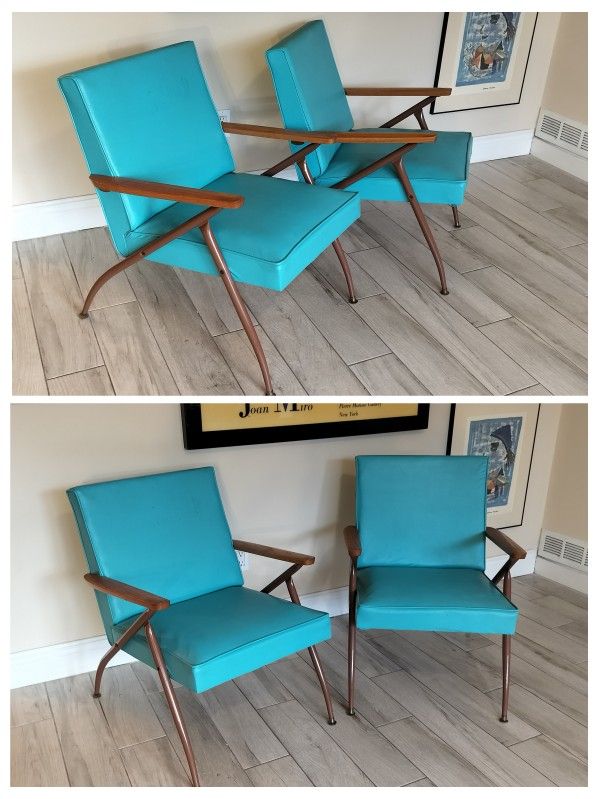 Vintage Mid Century Attributed to Viko Baumritter, circa 1959 Pair Of Accent Chairs in Turquoise Blue. These Mid-Century armchairs have the poise to draw attention. Slanted tubular metal frames have wooden light walnut armrests and are capped with classic sliders at the feet. Underside with zig-zag exposed spring base. Frames supporting original upholstered box cushions. Minimal Wear Throughout Its Many Years. Sturdy and structurally sound. Dimensions: 29H x 19 Seat Width x 16H Floor to Seat x 23W Arm to Arm x 28D MATERIAL: Metal. Vinyl, Light Walnut Wood 595.00 FOR THE PAIR