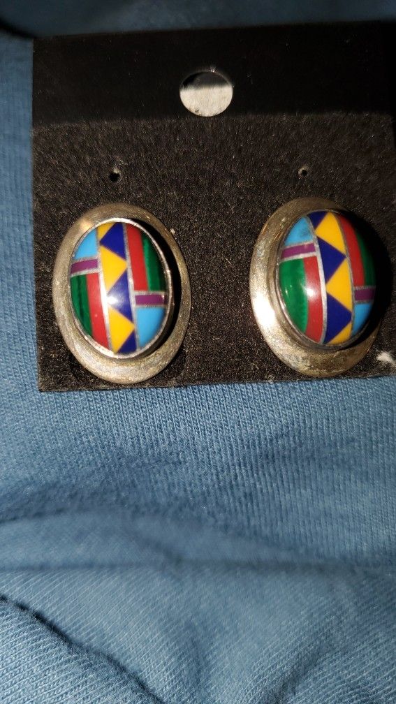 Sterling silver with southeast indigenous artwork. Contains malachite, lapis, amethyst and Onyx on the front.