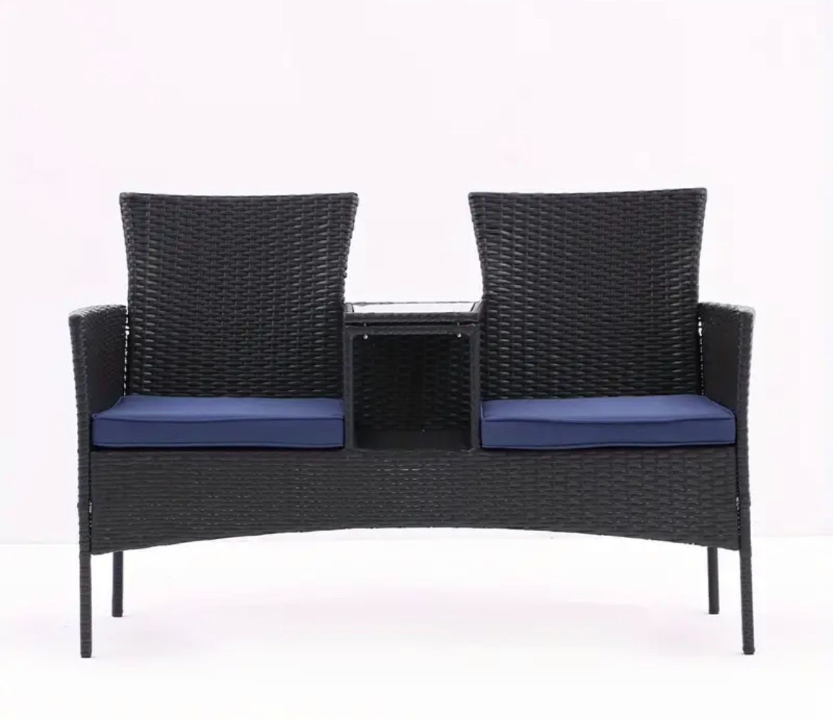 Outdoor Patio Loveseat Set, All Weather PE Rattan and Steel Frame Conversation Furniture with Built-in Coffee Table, Tempered Glass Top and Removable
