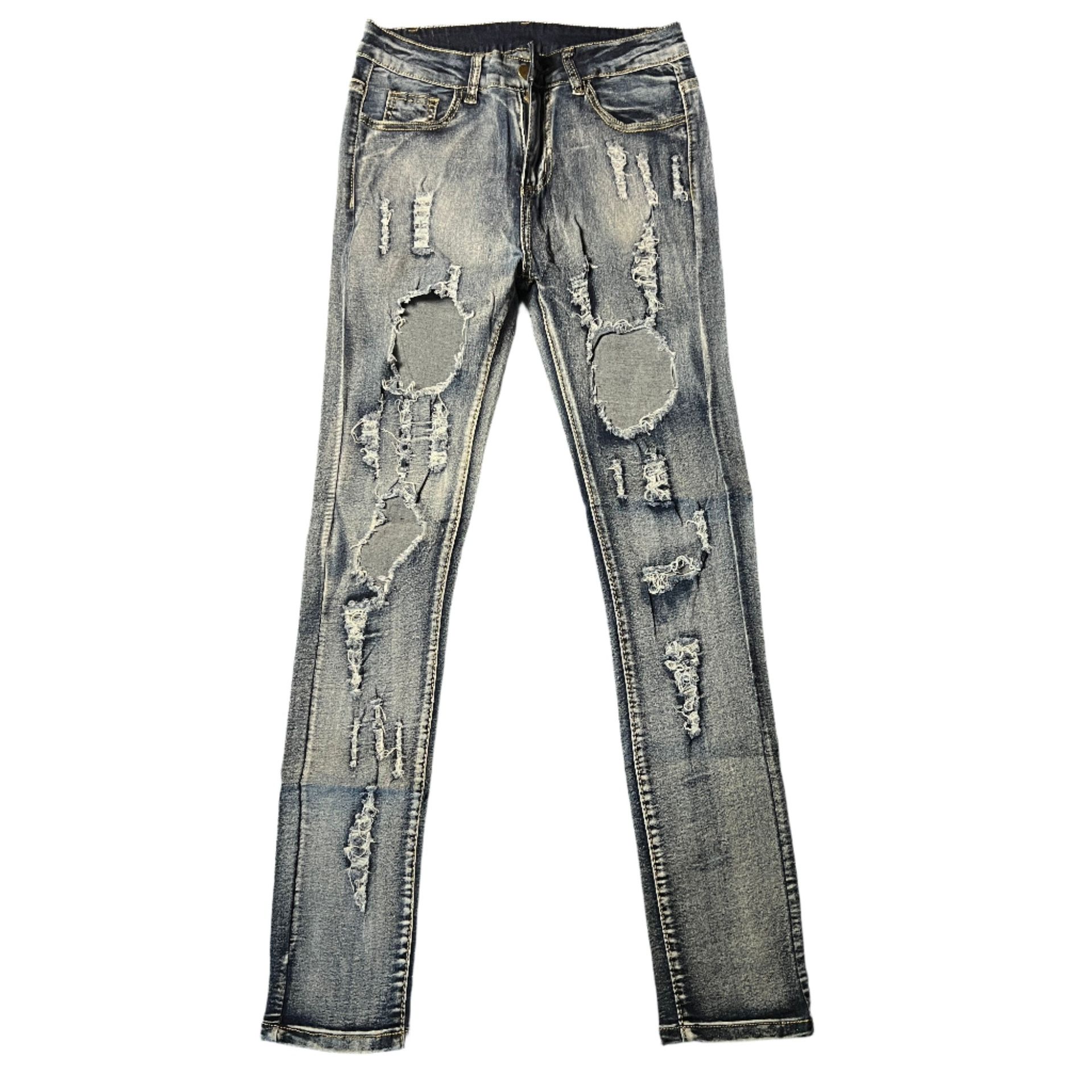 Elevate your everyday style with these Women’s Distressed High-Waisted Skinny Jeans, perfect for adding an edgy twist to any outfit. Crafted from premium denim, these jeans offer a flattering skinny fit that hugs your curves in all the right places. • Design: Featuring intricate distressed detailing along the legs, these jeans combine rugged charm with modern sophistication. The frayed patches and strategic rips create a bold statement while maintaining a trendy, casual vibe. • Fit: High-waisted for a secure and comfortable fit, these jeans sit perfectly at the waist, accentuating your silhouette and providing a slimming effect. • Material: Made from a soft, stretchy denim blend, these jeans offer both comfort and durability, ensuring they remain a staple in your wardrobe for years to come. • Versatility: Pair these jeans with your favorite crop top and sneakers for a relaxed day out, or dress them up with a blouse and heels for a night on the town. • Color: Classic medium-wash blue that complements a wide range of tops and accessories. Whether you’re going for a laid-back look or aiming to turn heads, these distressed skinny jeans are the perfect addition to your denim collection. Get ready to make a statement wherever you go!