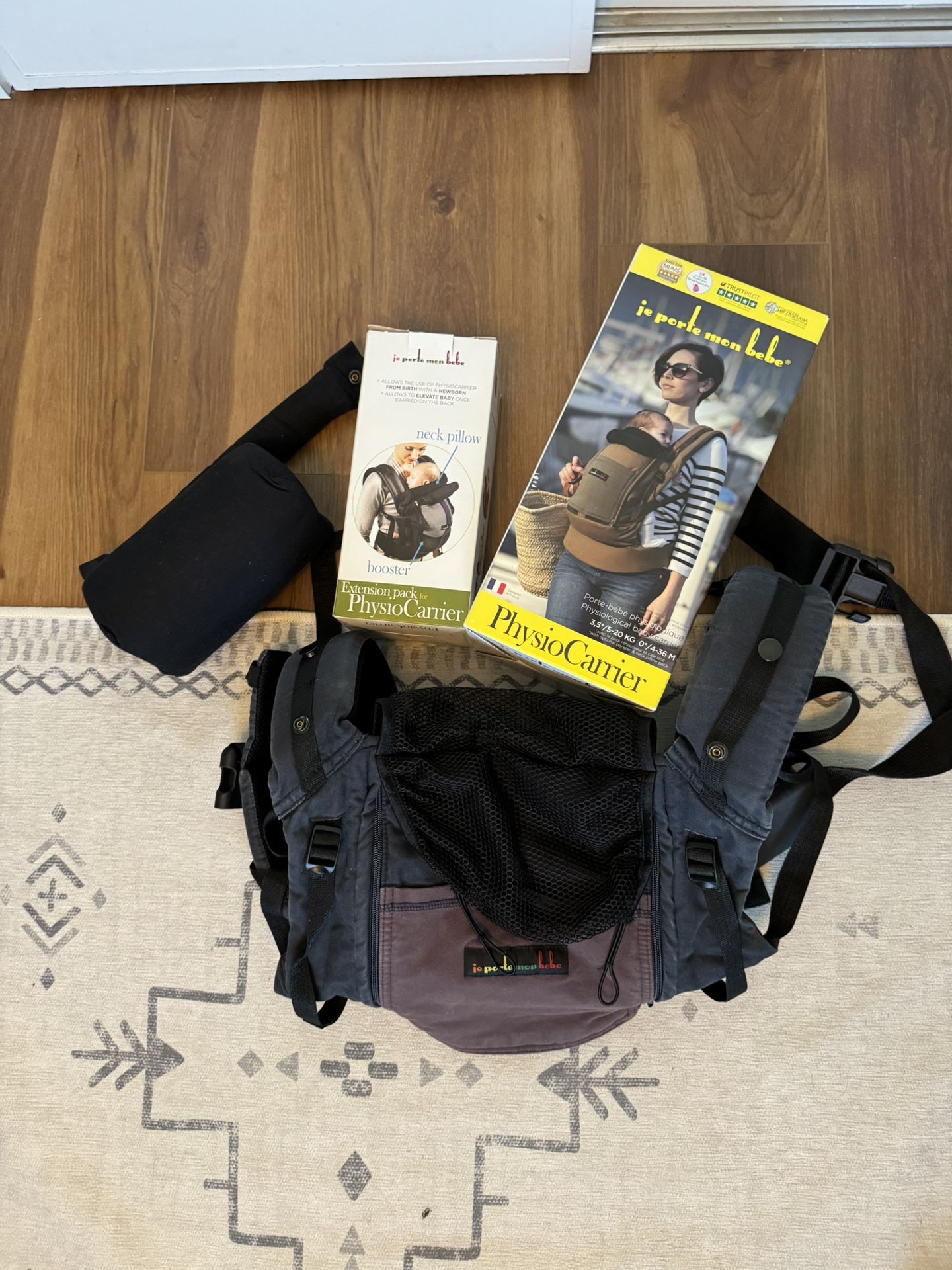 Je Porte Mon Bebe PhysioCarrier with infant extension pack ( booster, neck pillow). Great for hot or cold weather ( zip back reveals mesh to cool baby). Rated for Infant - 3 years. Great for home and out/ hiking. Washable. Comes with instruction book. Retail was $200. Liked it better than baby bjorn, ergobaby or lillebaby.