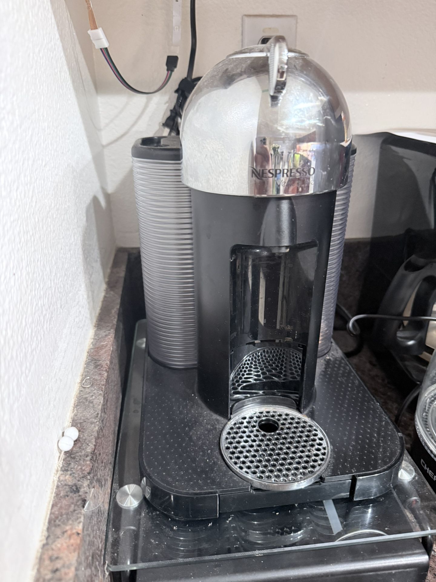Nespresso single-serve espresso machine with integrated water tank and capsule system. Sleek black and chrome design, compact footprint, fast heat-up, consistent espresso quality. Light cosmetic wear, fully functional.