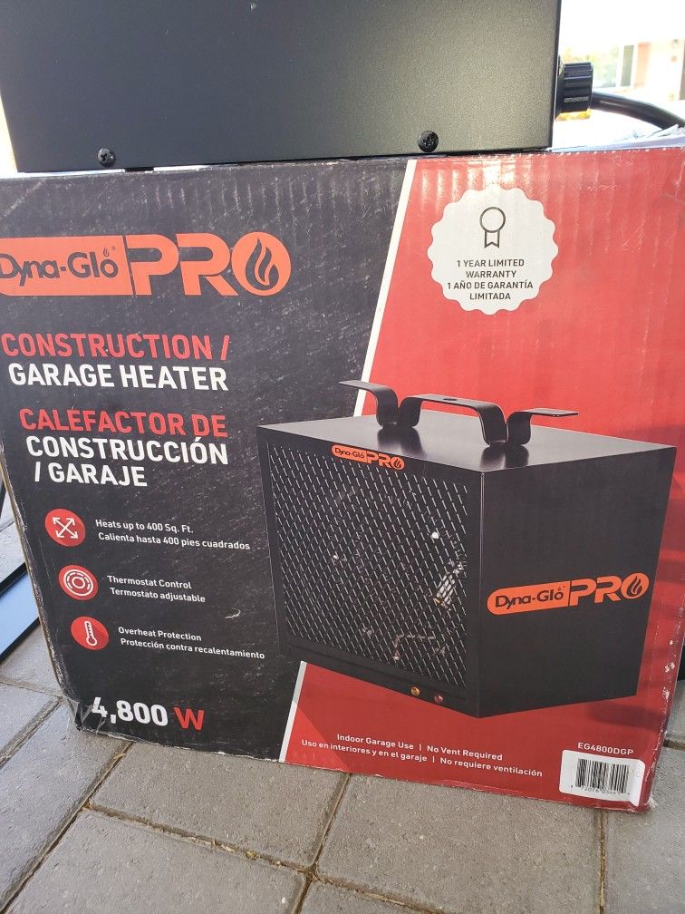 New Dyna Pro Garage Heater 2-heat settings BTUs: 12,285 low, 16,380 high Fully enclosed motor Space saving ceiling mounted design Fully assembled NEMA plug included Heats areas up 400 sq. ft. Dimensions: D (in.) 9.7 in x H 12.8 in x W 10.6 in Asking: $75 Cross streets are Apache and McClintock in Tempe
