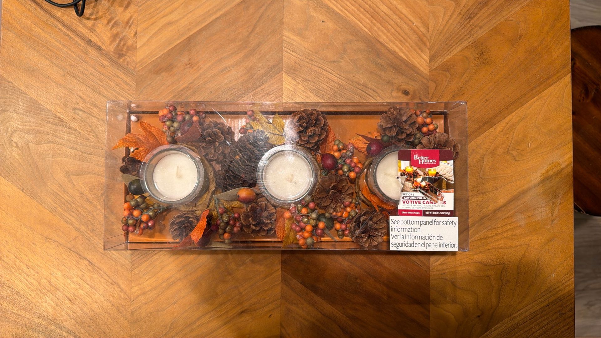 For Sale: Set of 3 Autumn foliage votive candles in clear glass cups. Each weighs 1.76 oz. Price: $5. Perfect for next year’s harvest hosting.