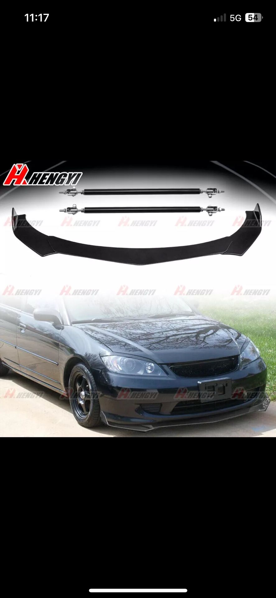 Honda Civic 2001 to 2005 front bumper lip JDM PDM Style strut rods included Might also fit 1996 to 2000 Honda Civic coupe/sedan New in box glossy black color Asking $50 obo
