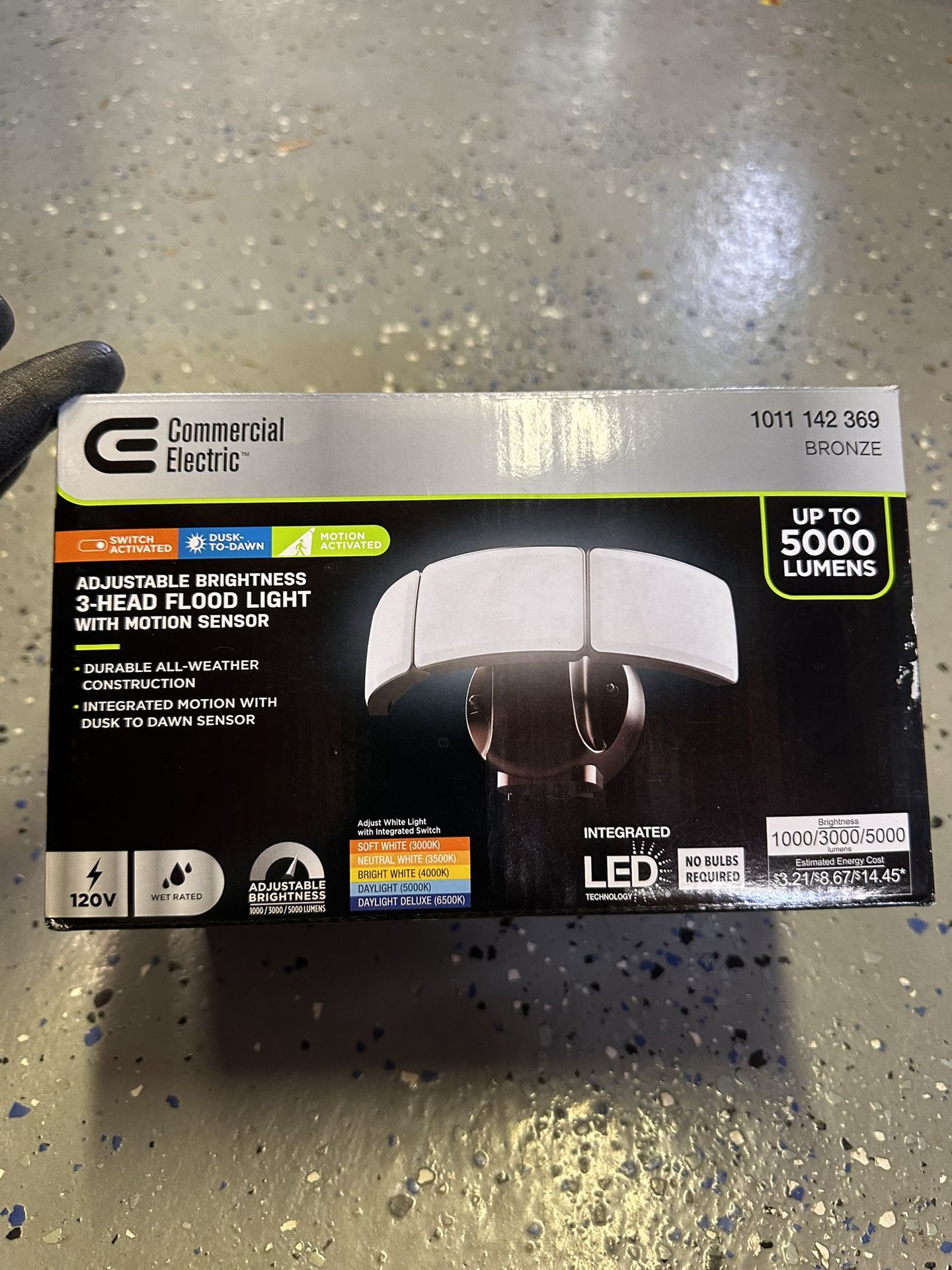 New, open box. Commercial electric 3 head adjustable flood light with motion senso. Brightness up to 5000 lumens. Motion range up to 50 feet! Can Be used as a security light.