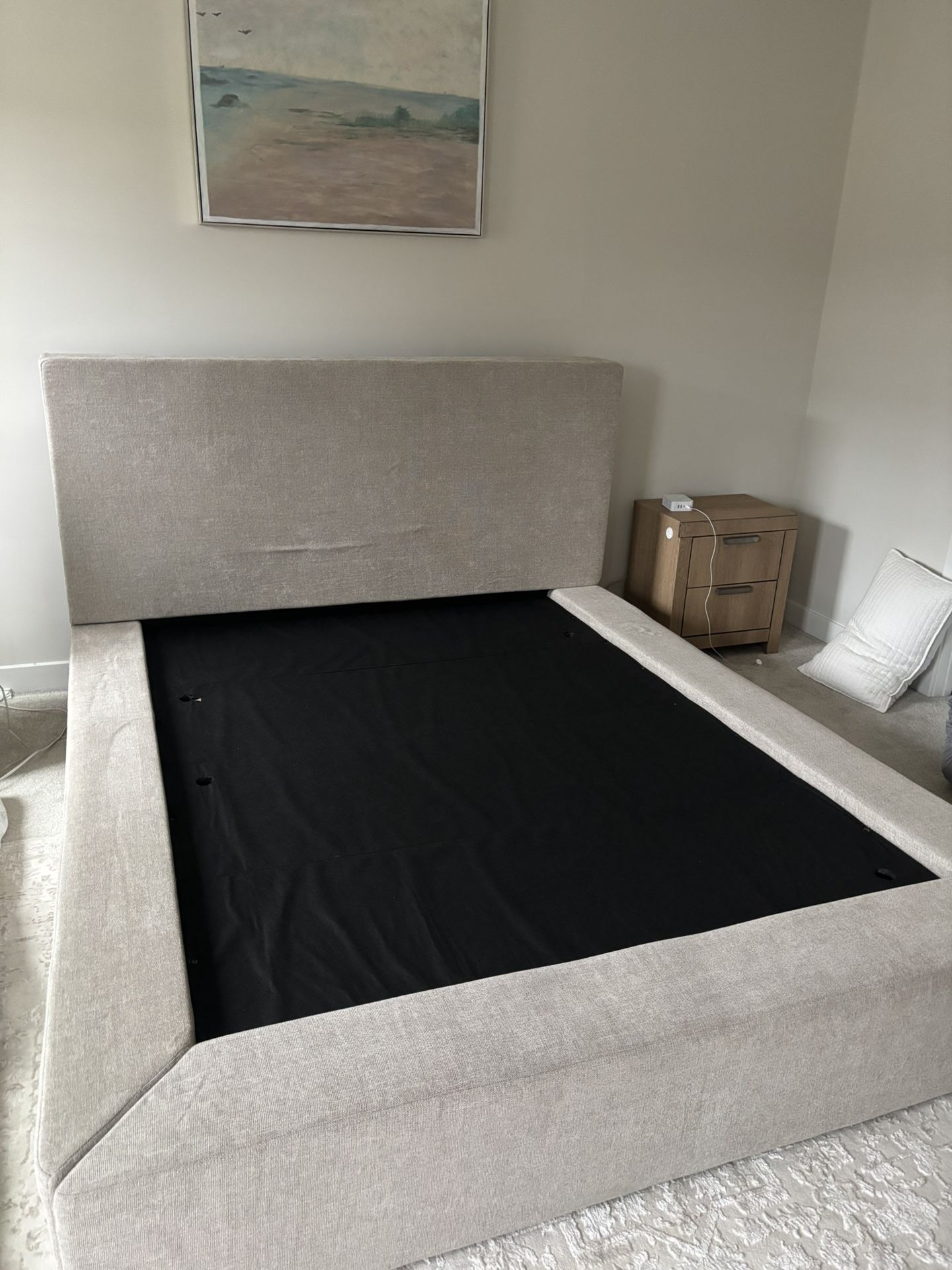 Bed used for less than 6 months All solid wood underneath and foam and fabric upholstery Fit for queen size bed Platform base so you wont need a boxspring- will fit any mattress including adjustable bed or any tempurpedic Color is like beige gray Back cushions come with the frame I have wet vaccumed with bissel for the upholstery No pets or kids in the house very well taken care of Smokeless (This will be disassembled and ready for pickup and all hardware will be provided of course) Dimensions of entire frame : 79iches wide 99inches deep/long 49inches tall