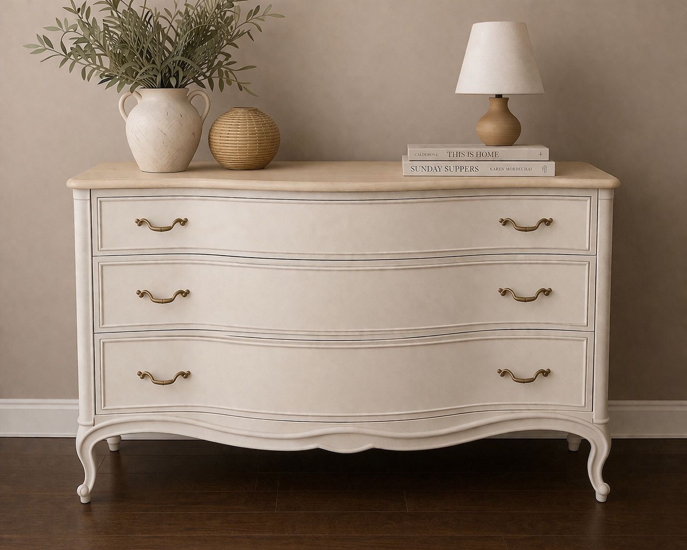 Cream French Provincial Dresser w/ Beige Top – 3 Drawer