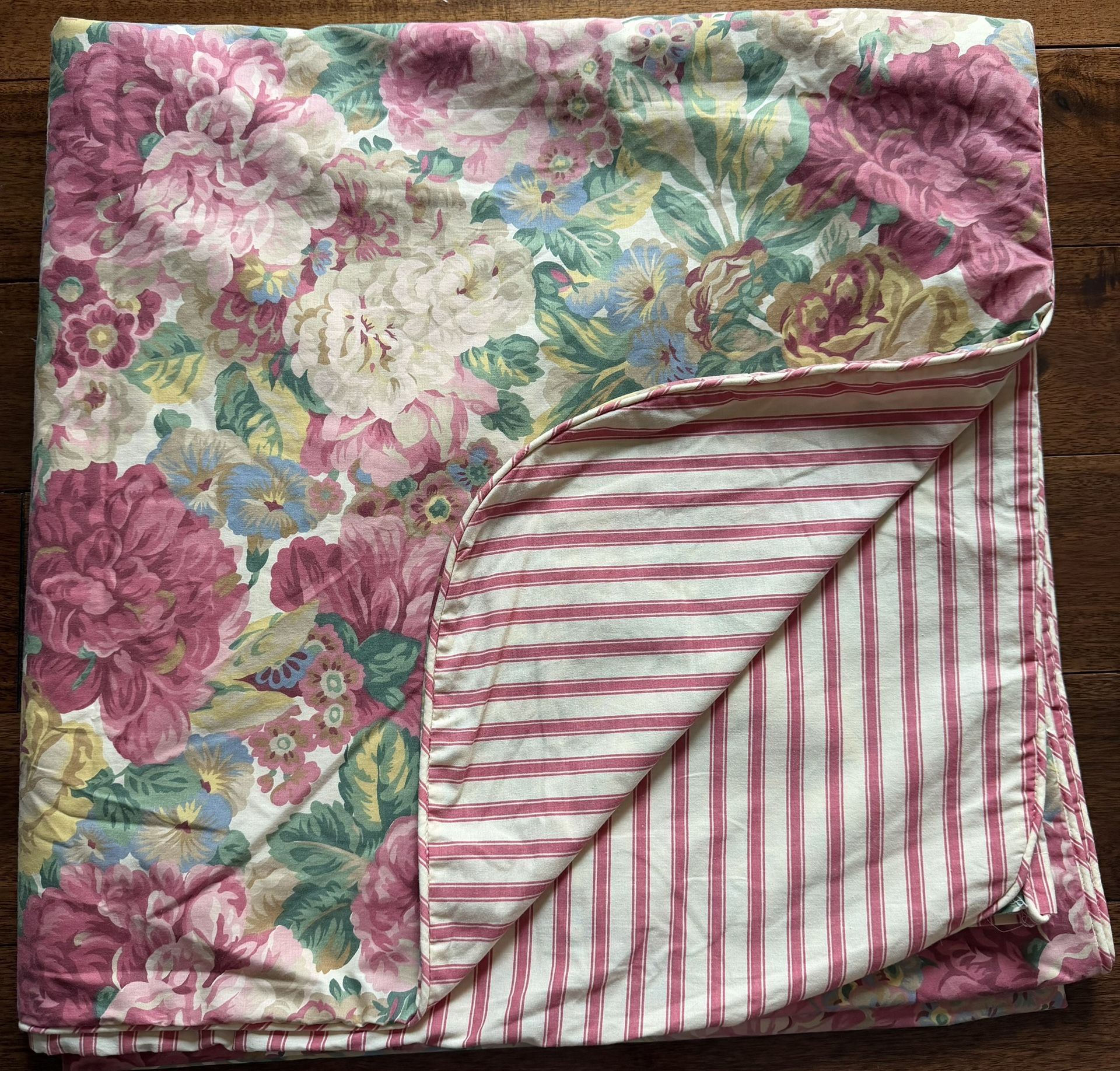 Custom Handmade Cotton Floral & Pink/Ivory Stripe Reversible Full Duvet Cover.