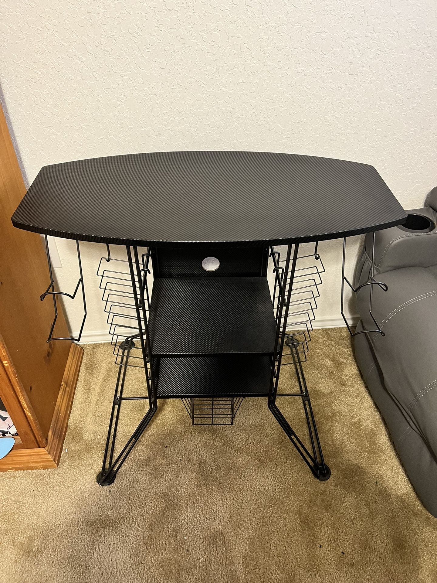 Has everything to hold all the gaming equipment you need and a little compartment on the bottom as seen in pictures , it is 30” long by 15 1/2” width and 29 1/2” in height