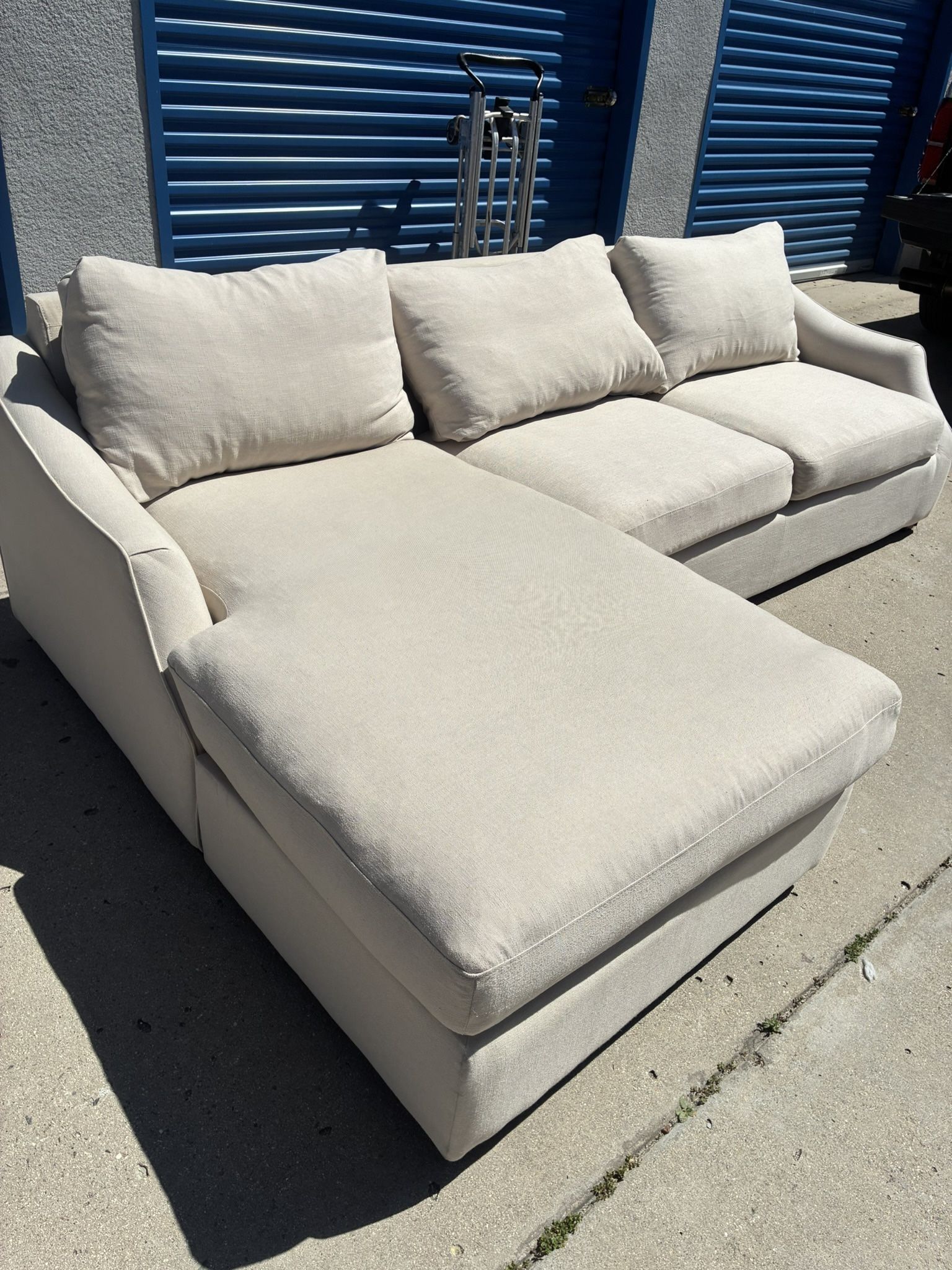 Couch/ sofa dimensions: 106in x 64in Depth: 36in Seat Depth: 22in Height: 31in Seat Height: 19in ➖Separates in 2 pieces. ➖Down and feather filling. ➖the zipper stopped working on 2 cushions but it was sewn shut. ➖Located San Diego -Lakeside area. 🛻Delivery Available🛻