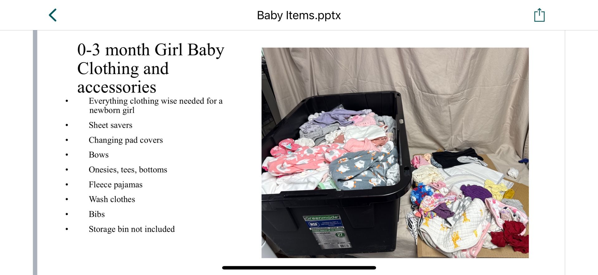 Everything clothing wise needed for a newborn girl •Sheet savers •Changing pad covers •Bows •Onesies, tees, bottoms •Fleece pajamas •Wash clothes •Bibs •Storage bin not included