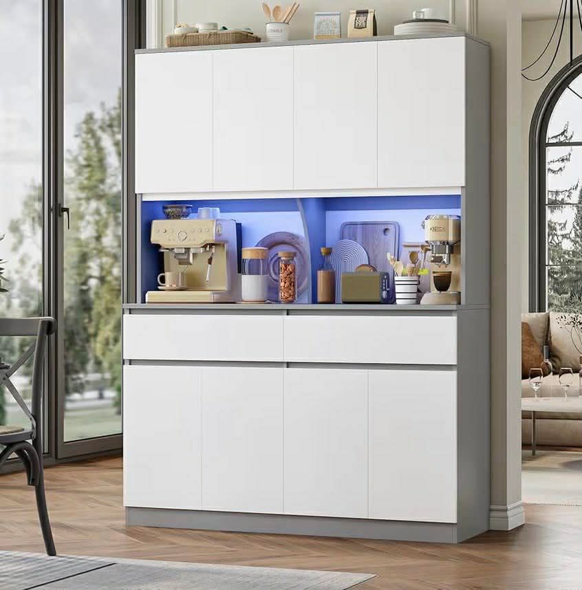 75"H x 55"W Kitchen Pantry Cabinet with LED Lights and Doors, Large Kitchen Hutch Storage Cabinet with Drawers, Food Pantry with Microwave Stand and C