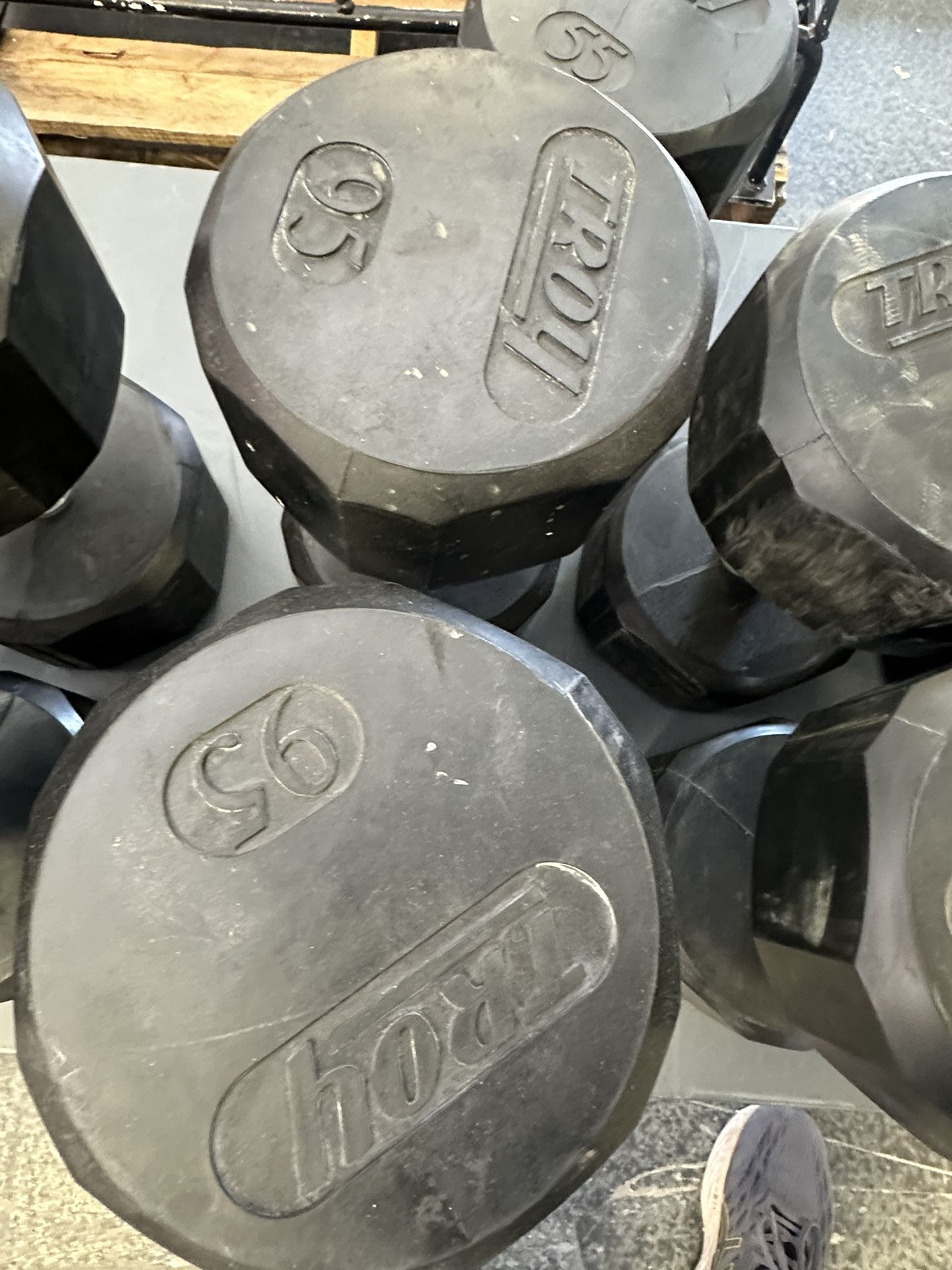Pair of 95 lb rubber coated 12 sided Troy dumbbells. Excellent condition. Original retail approximately $570 before tax. Letting go for $1/lb.
