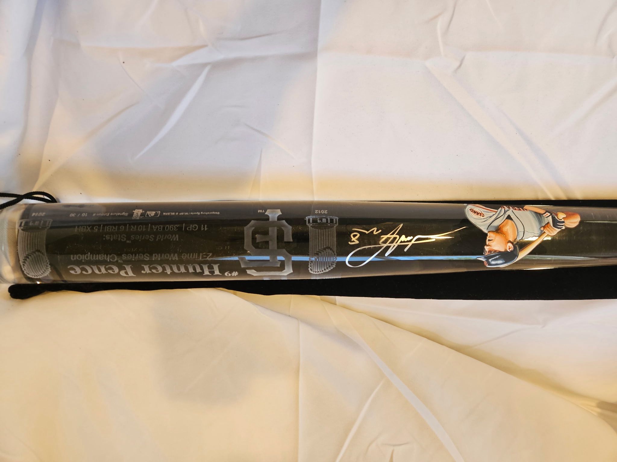 Unique 1-of-1 Hunter Pence collectible bat featuring detailed hand-painted art, “World Series Champion” graphics, and a bold signature. Authenticated with JSA sticker P75630 and McKay Custom Sports A000440 on the knob. Includes the original velvet sleeve. Condition is excellent—displayed only. Perfect centerpiece for a Giants fan cave or office. • Hand-painted 1/1 piece • 2012 World Series theme & SF logos/trophy • JSA + McKay authenticated • Velvet carry/display sleeve included Meetup: Cash only, Benicia/Martinez area. Trades: Open to sports memorabilia/sealed product/slabs 600 OBO…Priced with room for offers, serious inquiries only—thanks!
