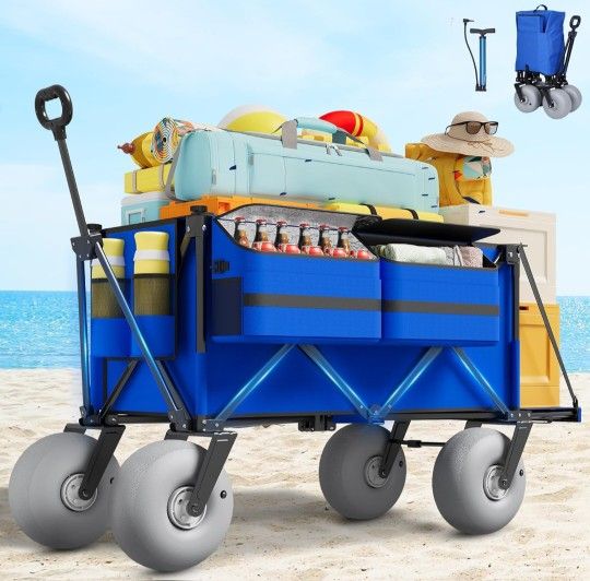 Beach Wagon with Big Wheels for Sand - 400lbs Load Heavy Duty Wagons Carts Foldable with 9" All Terrain Inflatable Tires, Collapsible Beach Cart for Grocery Shopping Garden Sports Camping Outdoor